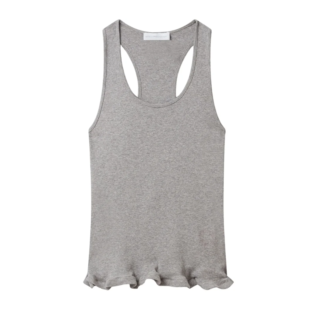 A refined essential, this ribbed tank top introduces subtle femininity through a frilled hem detail. Crafted from organic cotton, it balances everyday versatility with delicate finishing. - Color: Grey melange - Organic cotton ribbed jersey - Slim-fit tank silhouette - Sleeveless design - Crew neckline - Frilled hem detail - Made in Portugal - Composition: 100% Cotton