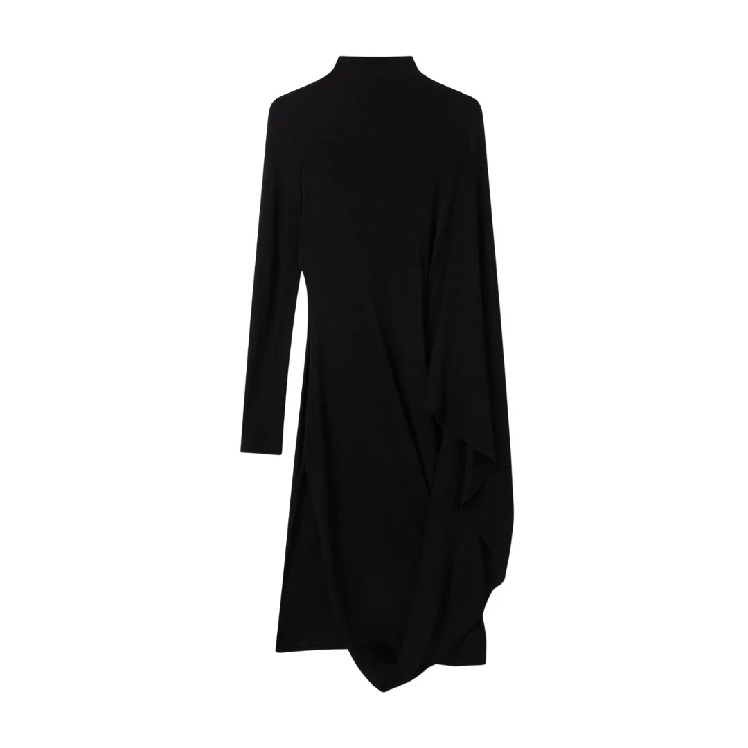 Spun from forest-friendly viscose, this asymmetric midi dress is both directional and dramatic – shaped to a slinky, knee-length silhouette with a single long sleeve contrasted with a cape wrapping around the other. - Color: Black - High-neck - One long sleeve - One long cape sleeve - Knee-length hem - Zipper fastening - Made in Italy