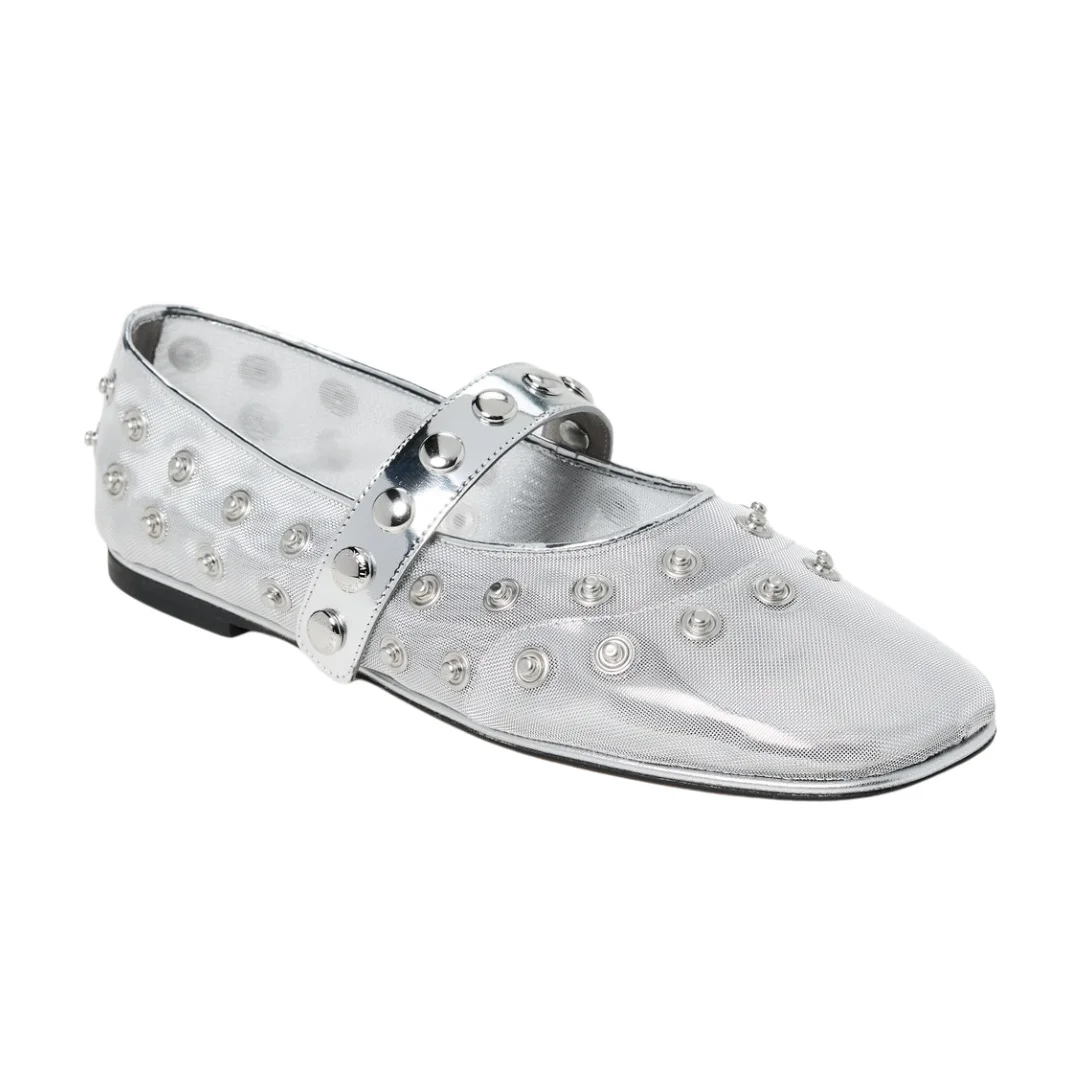 Sculpted from a soft, breathable mesh, this feminine ballerina is outlined in studded all-over silver poppers – adding a punky Stella McCartney edge. Finished with a Mary Jane snap closure that can be fastened across the foot. - Color: Silver - All-over silver popper stud embellishment - Fully lined with post-consumer recycled PET - Lining is comfort - enhanced with padding and moisture-wicking technology - Adjustable snap closure - Made in Italy