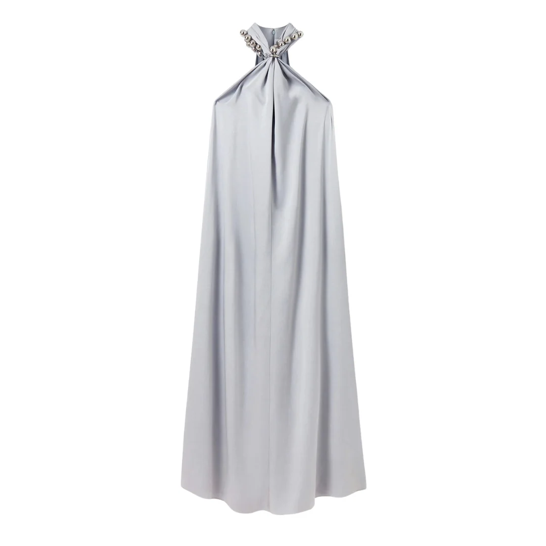 Spun from lustrous, forest-friendly viscose satin, this silky-smooth maxi dress begins wrapped around a ball-chain collar. Cascading straight past the hips to a floor-length hem, it’s thoughtfully stitched with slip pockets on either side for classic Stella ease. - Color: Pearl blue - Halterneck - Ball-chain embellished collar - Wrap-over at chest - Two slip pockets - Floor length hem - Lustrous satin finish - Zipper fastening at back - Made in Italy