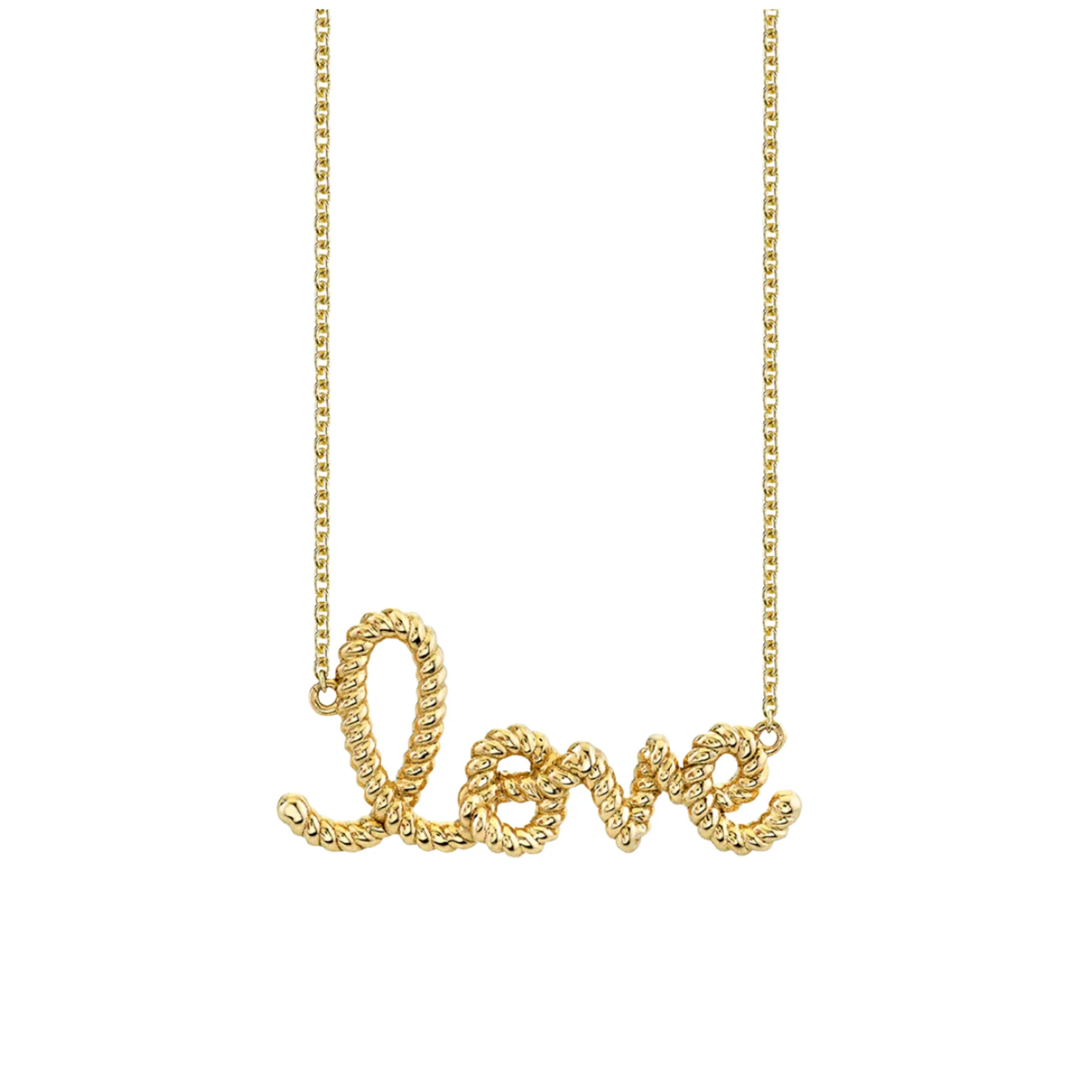 14k yellow gold medium love script rope necklace. The script measures approximately 1/2"H x 1"W. 14k gold cable chain is 16" long with an extender at 18".
