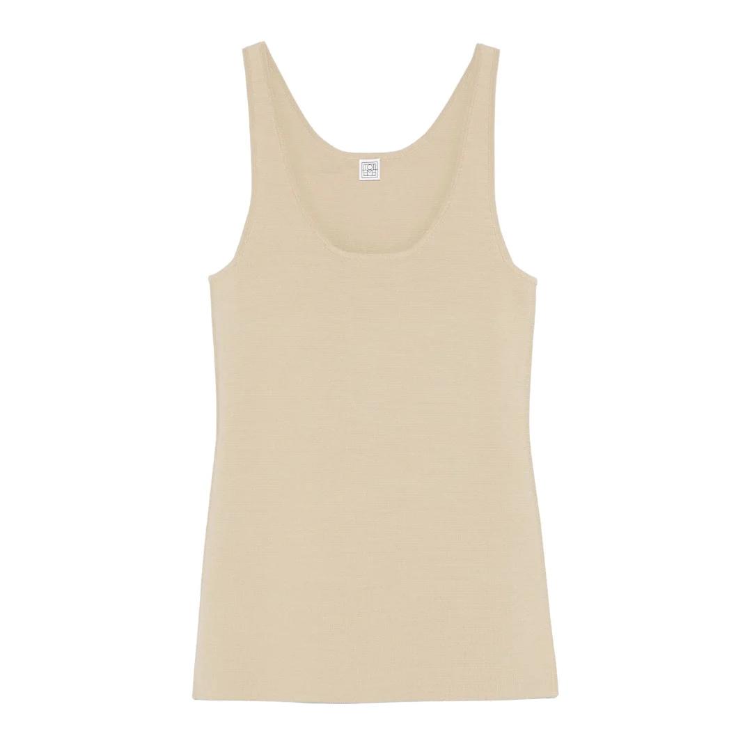 Designer’s note: “This TOTEME tank has been with us for many years and is now part of the Garderob curation. What we love about it is the strong yet alluring scoop neckline paired with a slim silhouette knitted from compact jersey – a fabric we return to time and time again because of how it holds the body, offering a comforting sense of security.” - Desert - 53% viscose, 45% polyamide recycled, 2% elastane