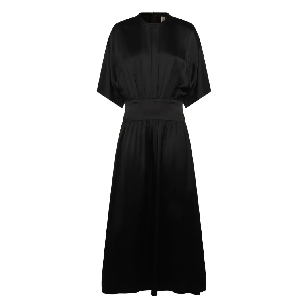 Short-sleeve satin maxi dress - black - short-sleeve - waist detail - round neck - rear zip fastening - Viscose 100%