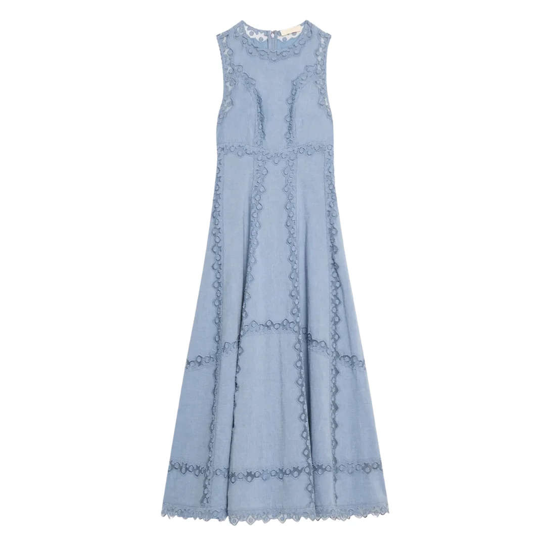 The Anela Dress is made from soft, water-washed cotton that’s enlivened by geometric ribbon embroidery and tulle appliques for a play on transparency. This timeless summer frock arrives in chambray blue, with a sleeveless silhouette that skims the form and a gently flared hemline. It is lined in the bodice and fastens with a concealed back zipper. Composition: 100% Cotton