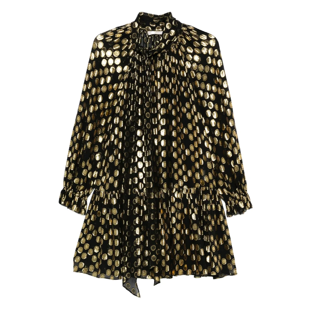 Flickering across the AW25 runway in Look 14, the Loretta Dress is crafted from lurex dot fil coupe, brought to life with golden polka dots woven into delicate black silk. The soft tie at the neckline creates flowing movement, while the fluttering, tiered hemline adds a playful finish. - Lurex dot fil coupe - Designed for an oversized fit - Mini length, dropped waist - Attached scarf necktie - Long sleeves with elastic cuffs - Removable slip, Pullover style - Composition: 83% silk, 17% polyester