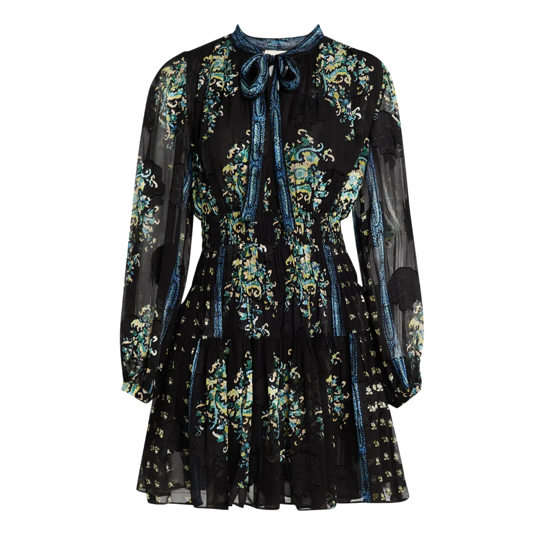 necktie long-sleeve paisley printed mini dress