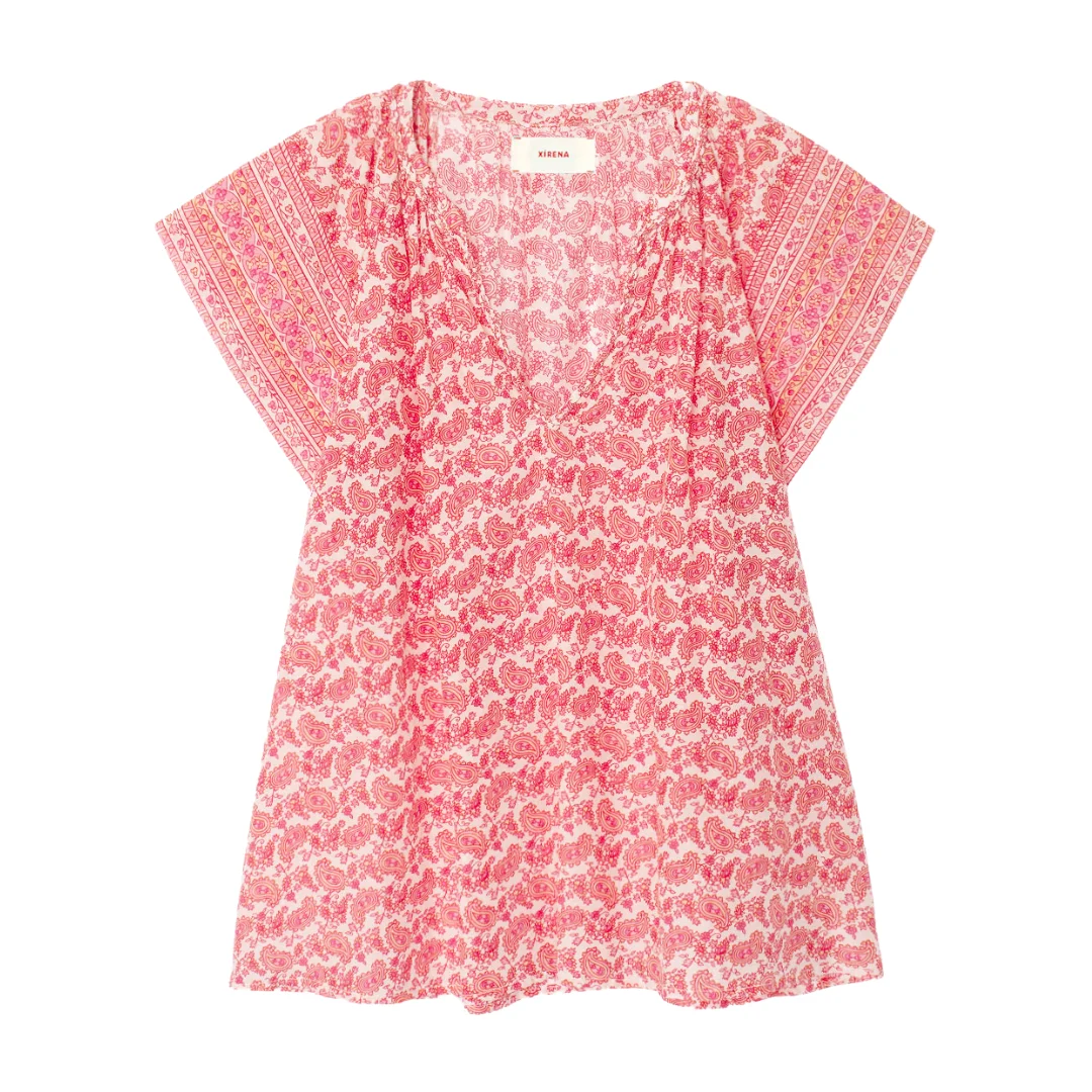 Pretty in Print. Clover is made in a paisley border print cotton silk voile for an elevated feel. This easy popover top features a v-neck with braided trim and cap sleeves. - Fabric: Paisley Park Border Printed Silk Cotton Voile | 70% Cotton, 30% Silk - Designed in Los Angeles