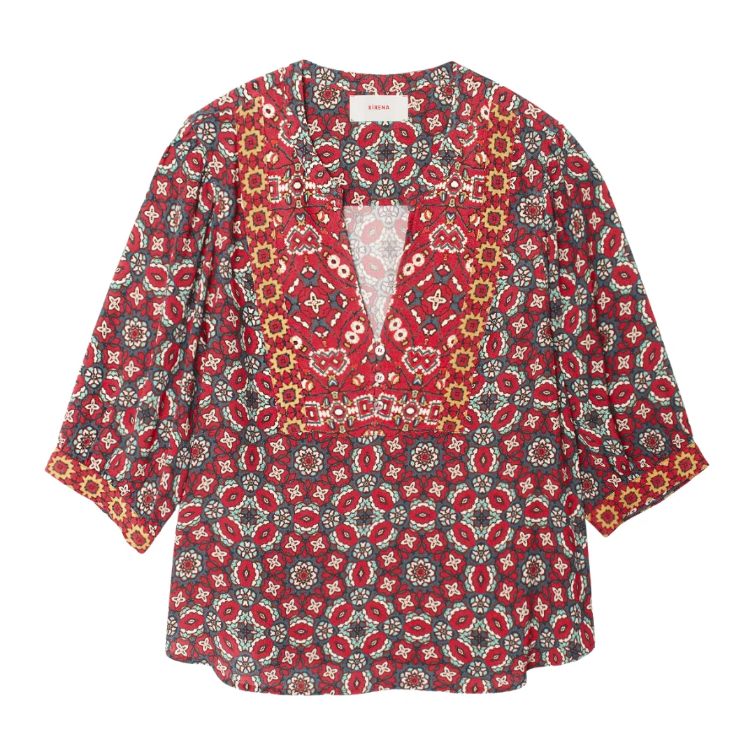 Mosaic Medley. Corrine is new this season in a mosaic tile print viscose rayon. This femme blouse features a V-neck, button-front bib, elbow blouson sleeves, high low hem, and back yoke. - Fabric: Tangier Tile Printed Viscose Rayon | 55% Viscose, 45% Rayon - Designed in Los Angeles