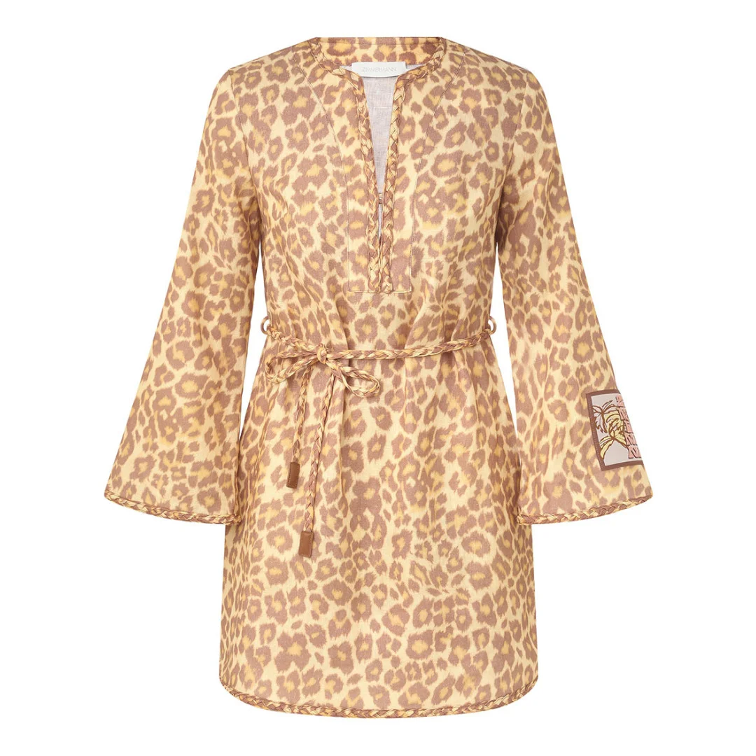 The Awaken Braid Trim Tunic in Lemon Leopard from Resort Swim 2026 Collection. A linen mini dress featuring a plunging V-neckline, long sleeves and partial side splits, finished with a removable waist belt. - Linen fabric - Tunic silhouette - Self-tie braided belt - Long sleeves with wide cuffs - Braided trim detailing - Rouleau buttons across bust