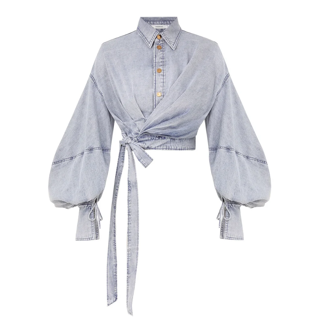 The Rebellion Denim Wrap Top in Castaway from Cruise 2026 Collection, Twisted Romance. A cropped denim blouse featuring a classic collar, gold snap buttons down the centre front, long billow sleeves with exaggerated cuffs, finished with a wrap waist belt tied to one side. - Cropped denim shirt - Self-tie wrap belt at right hand side - Rouleau ties at fitted cuffs - Long blouson sleeves - Heavily gathered