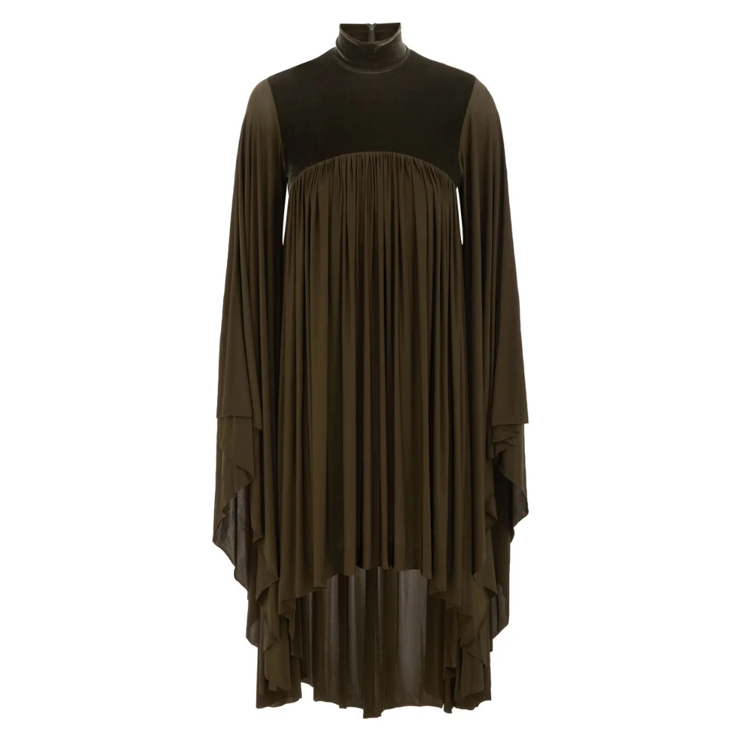 The Memento Batwing Mini Dress in Olive. A velvet mini dress featuring long batwing sleeves, heavy gathering throughout, a high neckline, and asymmetrical hem. - Mini-length dress - Long batwing sleeves with cascading hem - Heavily gathered throughout - Centre back invisible zip closure