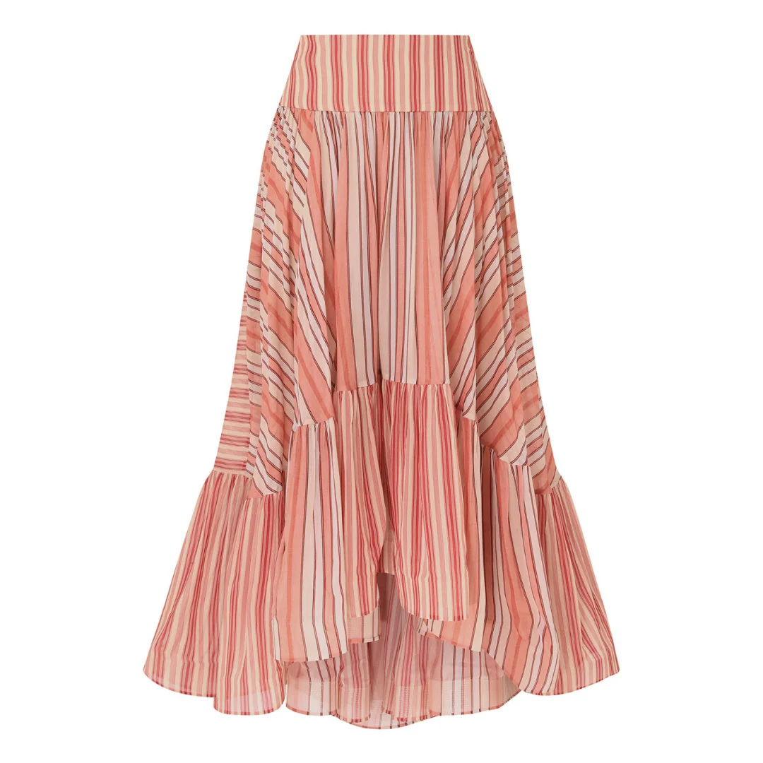 The Rebellion Bohemian Midi Skirt in Red Stripe from Cruise 2026 Collection, Twisted Romance. A midi skirt featuring a high-low gathered hemline, fitted waistband and an invisible zip closure at centre back. - Elongated fixed waistband - Gathered ruffle hem - Invisible zip closure at centre back