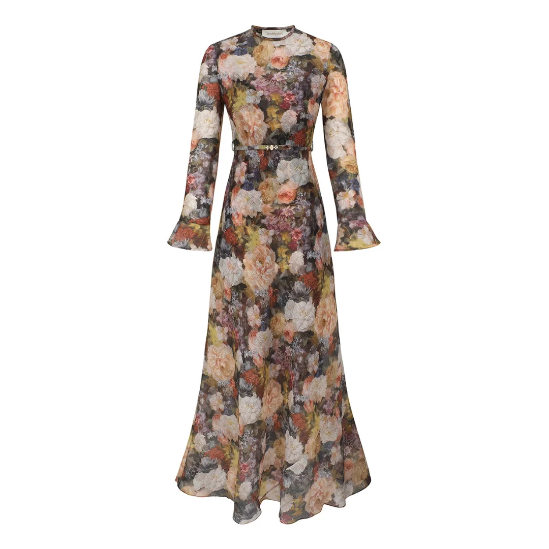 The Alchemy Sheath Dress in Rosette from Zimmermann's Spring 2026 Collection, Kindred Spirit. A silk-linen maxi gown featuring a round neckline, long fitted sleeves with wide cuffs, finished with a flared skirt and invisible centre back zip. - Silk-linen blend fabric - Round neckline - Flared sleeve cuffs - Zipper opening across both shoulders - Removable waist belt - Comes with a separate slip