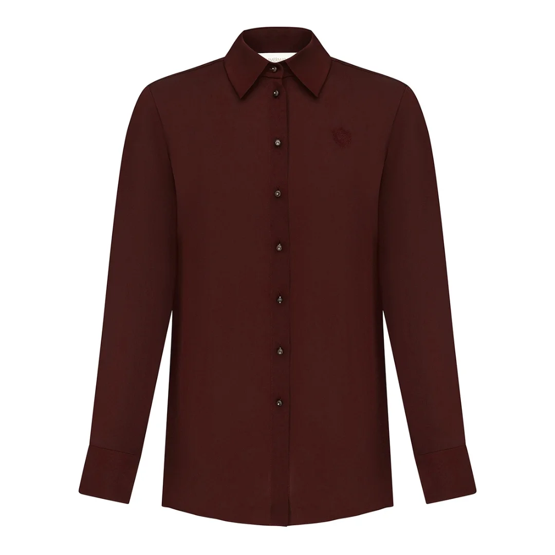The Luna Satin Shirt in Wine from Zimmermann's Spring 2026 Collection, Kindred Spirit. A silk shirt featuring long sleeves, embroidery detailing and a classic collar. - 100% silk fabric - Relaxed silhouette style shirt - Buttons down the centre front and on the cuffs - Embroidery detail on the breast