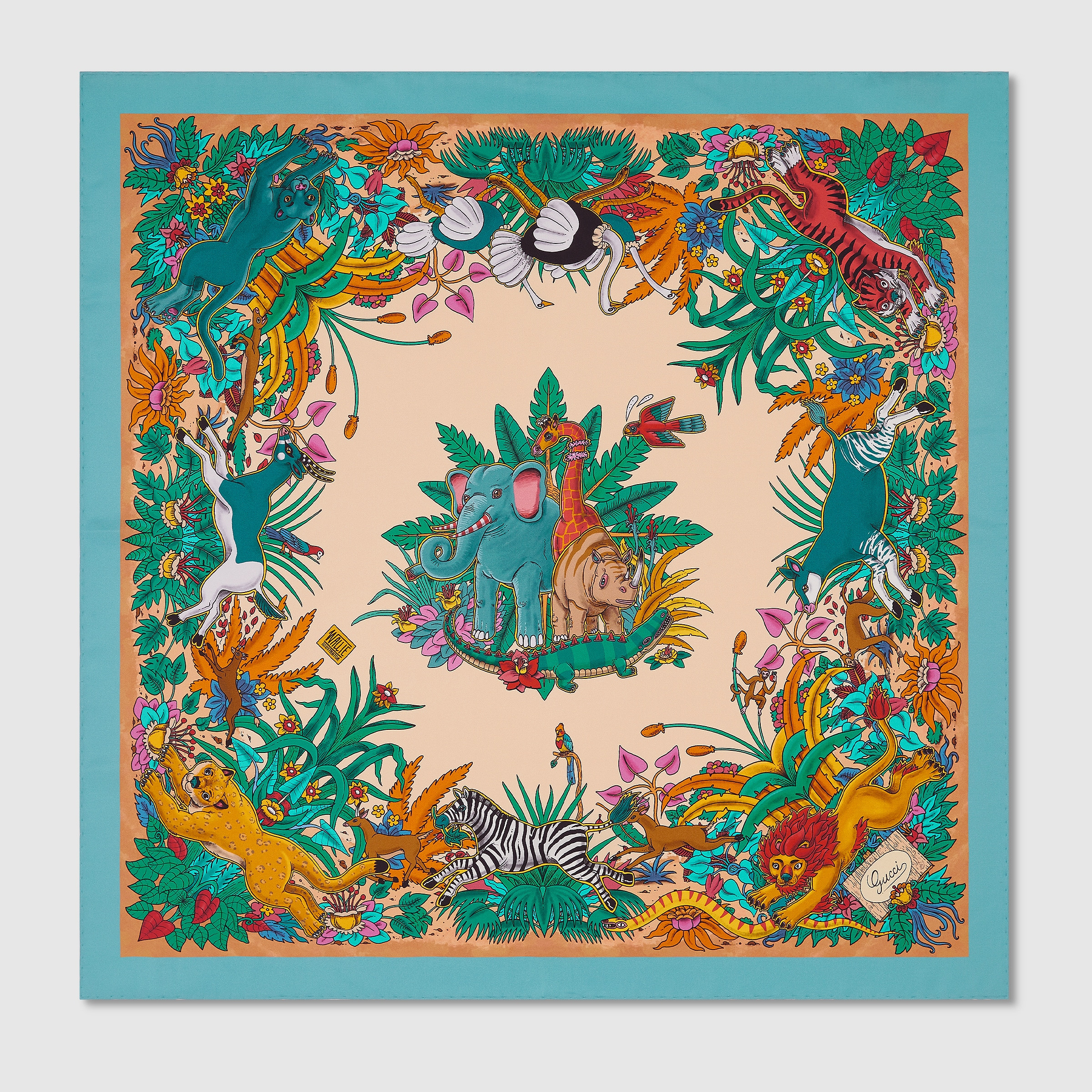 Featuring artwork by artist Wallie (Walter Petrone), whose vivid storytelling blends personal reflection with dynamic visuals, this carre explores Gucci's motif around nature as part of the 90 x 90 project. - Multicolor silk twill - Plants and animals print - Artwork by Walter Petrone - 35.4"W x 35.4"L - Made in Italy - The dimensions of this item may vary slightly as the hem is hand-sewn