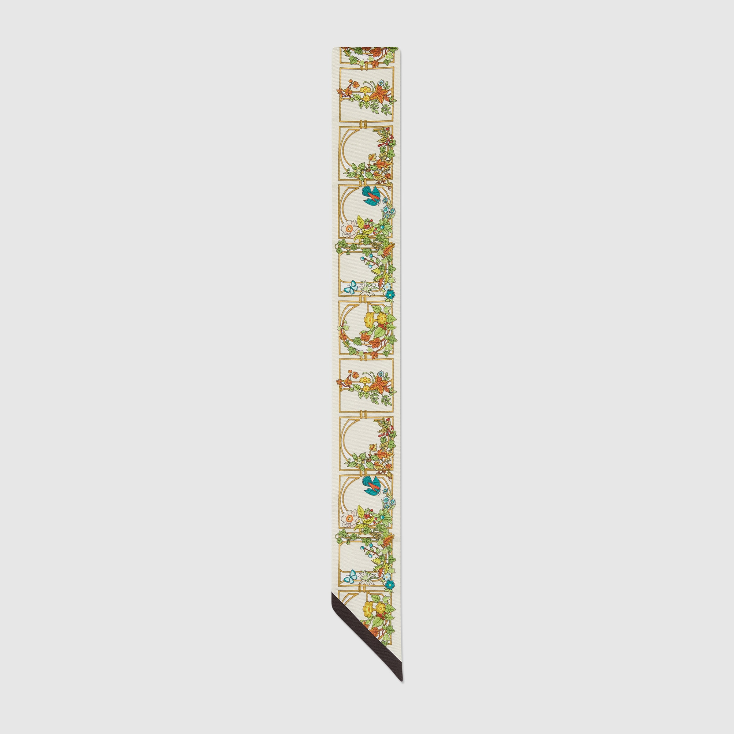 The House's heritage motifs shine through eye-catching new prints. Here, this neck bow features an animal and floral print, demonstrating Gucci's design inspirations from the natural world. - Multicolor Gucci animal and floral print ivory silk twill on one side - Beige and ebony GG print on the other side - 2"W x 33.9"L - Made in Italy