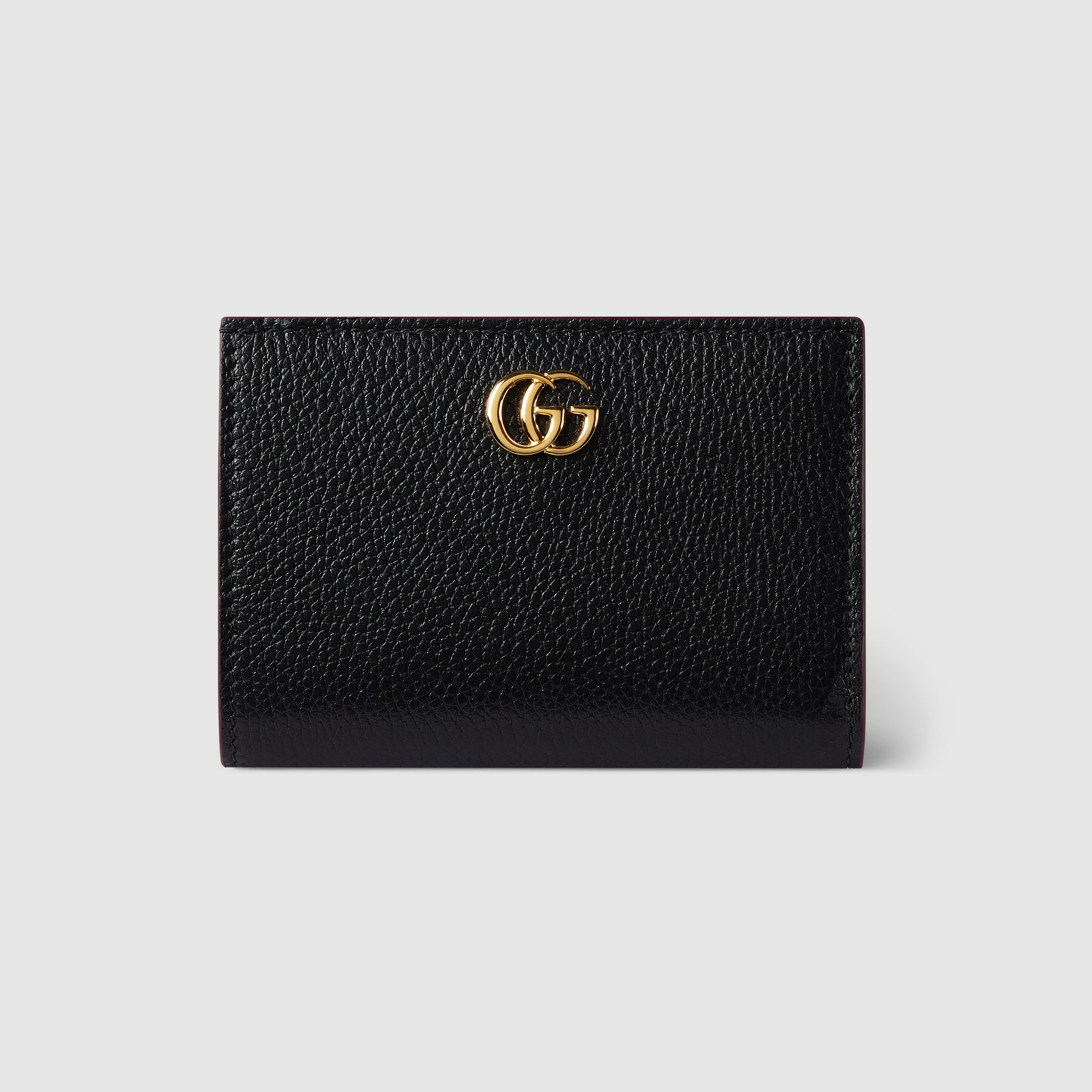This GG Marmont bi-fold wallet is presented in black and Gucci Rosso Ancora leather with the Double G gold-toned hardware in petite dimensions. The accessory is completed by a zip pocket and a snap button closure. - Black and Gucci Rosso Ancora red leather - Gold-toned hardware - Gucci Rosso Ancora red taffeta lining - Double G - Inside: 1 zip pocket, 6 card slots, 1 bill compartment - Snap and zip closure - 4.5"W x 3"H x 1.1"D - Made in Italy