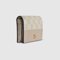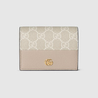 This GG Marmont mini wallet is crafted from leather in bege contrasted with beige and white GG Supreme. The structured design features the signature Double G hardware in gold-tone. - Beige and white GG Supreme and beige leather - Gold-toned hardware - Brown taffeta lining - Double G - Five card slots, one open pocket - One bill compartment - Interior zipper pocket - Snap closure - Closed: 4.3"W x 3.3"H x 1.2"D; Open: 4.3"W x 6.9"H - Weight: 0.29lbs approximately - Made in Italy