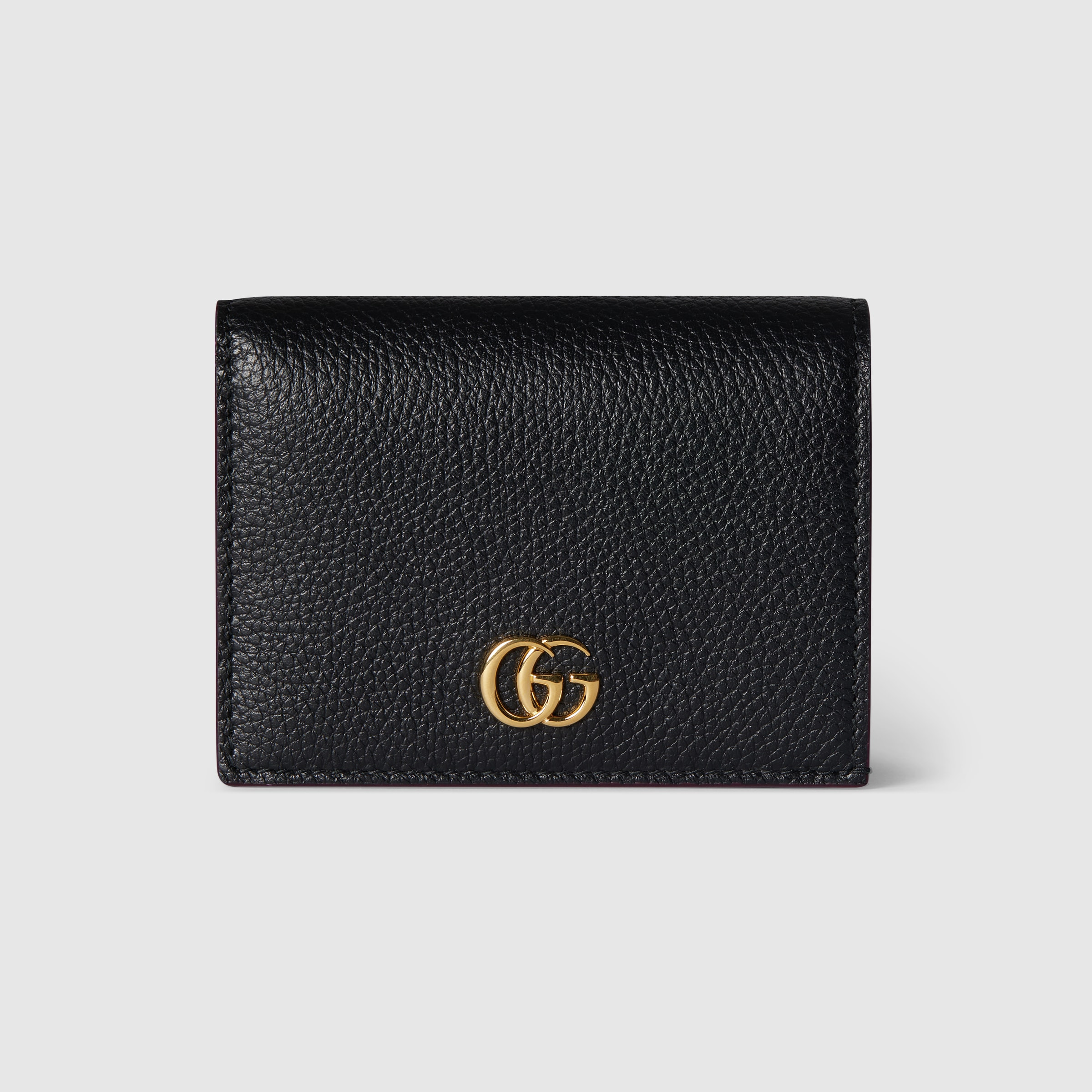 This GG Marmont small wallet reveals a contrasting color inside for an unexpected finish. The structured design features the signature Double G hardware in gold-toned finish. - Black and Gucci Rosso Ancora red leather - Gold-toned hardware - Gucci Rosso Ancora red taffeta lining - Double G - Five card slots, one open pocket - One bill compartment - Interior zipper pocket - Snap closure - Weight: 0.25lbs approximately - Open: 4.3" W x 6.9" H - Closed: 4.3" W x 3.3" H x 1.2" D - Made in Italy