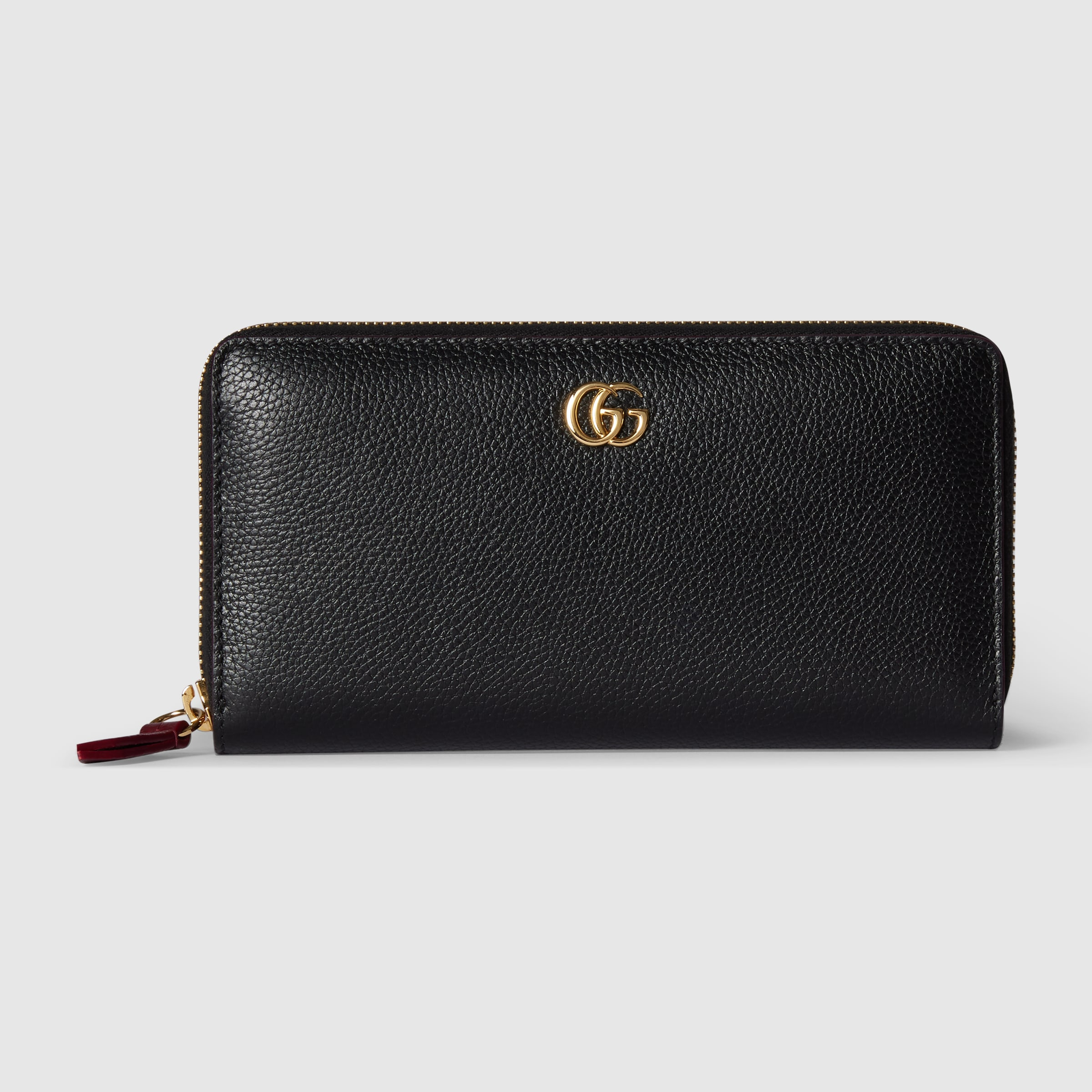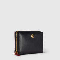 The GG Marmont small leathergoods collection presents contemporary silhouettes that blend different colors and materials in one style. This zip around wallet is crafted with leather in two different shades, complete with the archival Double G logo. - Black and Gucci Rosso Ancora red leather - Gold-toned hardware - Gucci Rosso Ancora red taffeta lining - Double G - 12 card slots and three bill compartments - Zip coin pocket - Zip around closure - Weight: 0.50lbs approximately - 7.5"W x 4.1"H x .8"D - Made in Italy