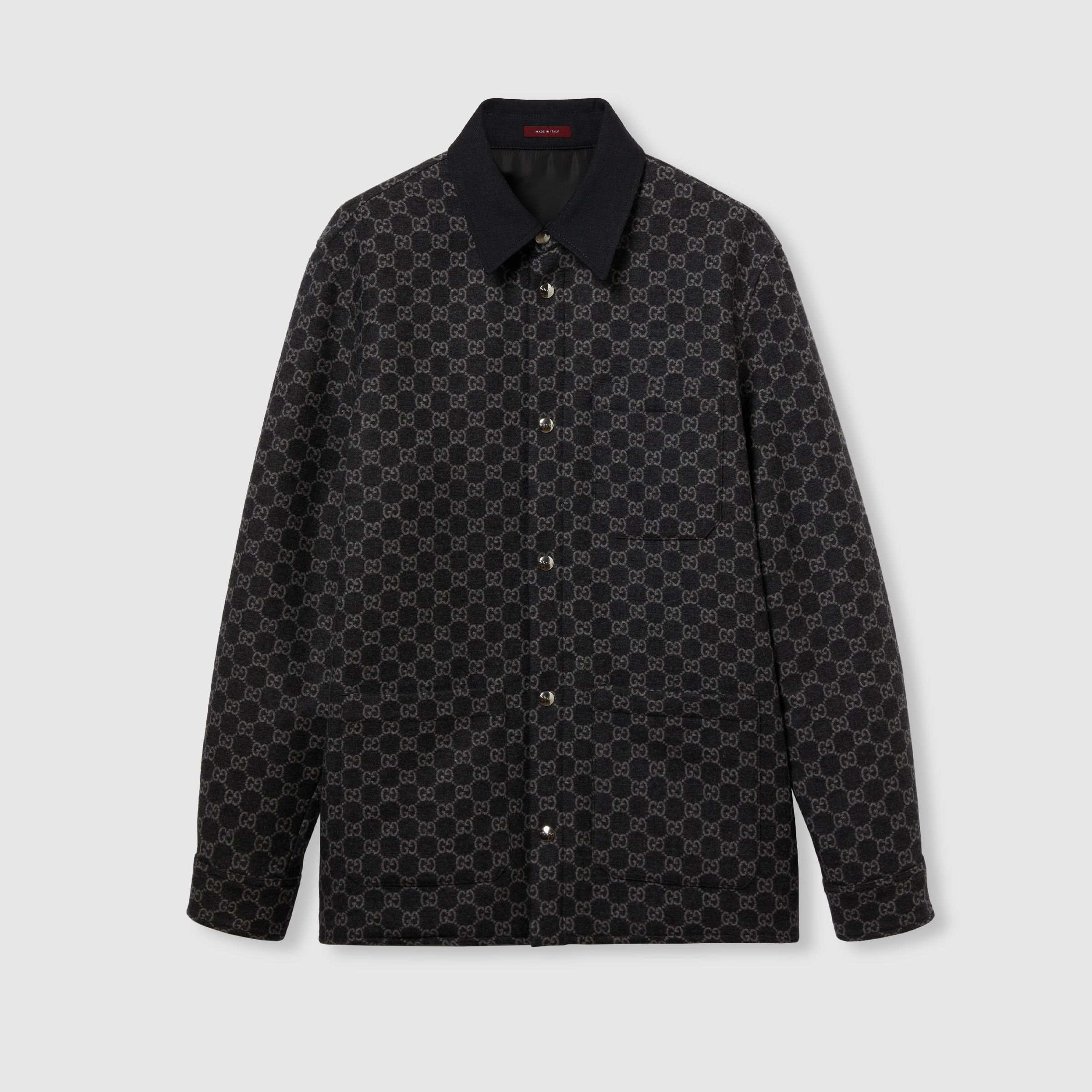 Pre-Fall 2025 pieces in muted black, grey and green tones spotlight embossed logos, and more craftsmanship details. This lightly padded jacket is stated in a brushed GG flannel with Gucci metal buttons. - Dark grey and grey brushed GG flannel - Gucci metal buttons - Contrasting point collar - Chest pocket - Two front pockets - Padded - Buttoned cuffs - Inside pocket - Snap button closure - Length: 30.7"; Shoulder: 20.5"; Chest: 24.8"; Sleeves length: 36.2"; based on a size 48 IT - Made in Italy