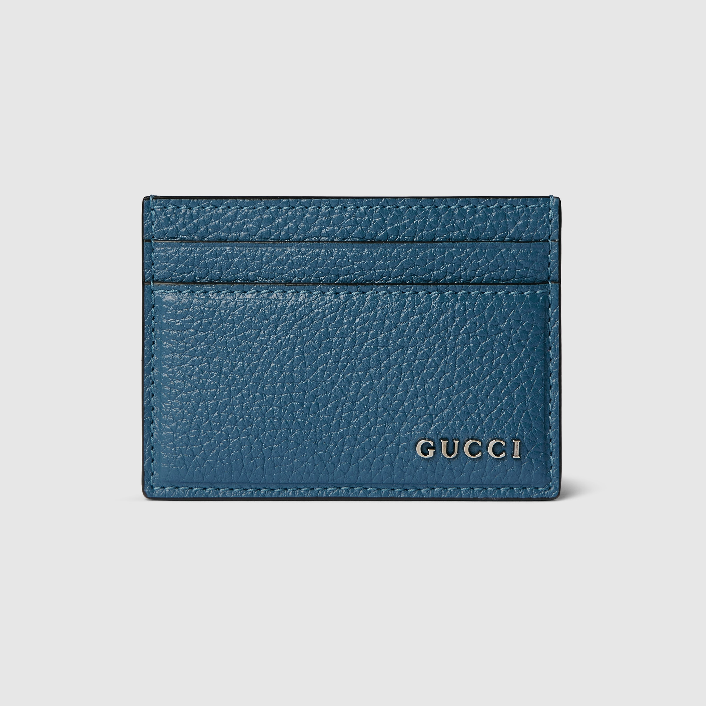 A selection of small leather accessories featuring the Gucci logo return for Pre-Fall 2025. Crafted from blue grainy leather, this card case features multiple card slots and an open pocket. - Blue grainy leather - Palladium-toned hardware - Blue moire lining - Gucci logo - Four card slots, one open pocket - 4"W x 2.7"H - Made in Italy - Weight: 0.14lbs approximately
