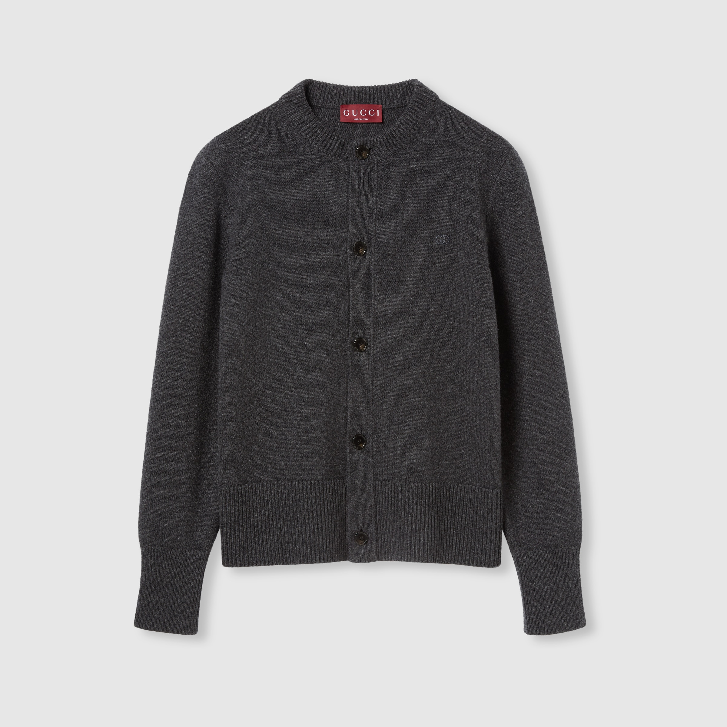 In the Fall Winter 2025 collection, knitwear essentials are defined by clean lines and subtle detailing. This long-sleeved cardigan features a crewneck, embossed Interlocking G logo and a classic button-up front. - Dark grey cashmere knit - Embossed Interlocking G logo - Crewneck - Ribbed neck, cuffs and hem - Button closure - Regular fit - Total length: 24.8"; Shoulder: 26.9"; Chest: 19.6"; Sleeve length: 26.3"; (size S) - Made in Italy