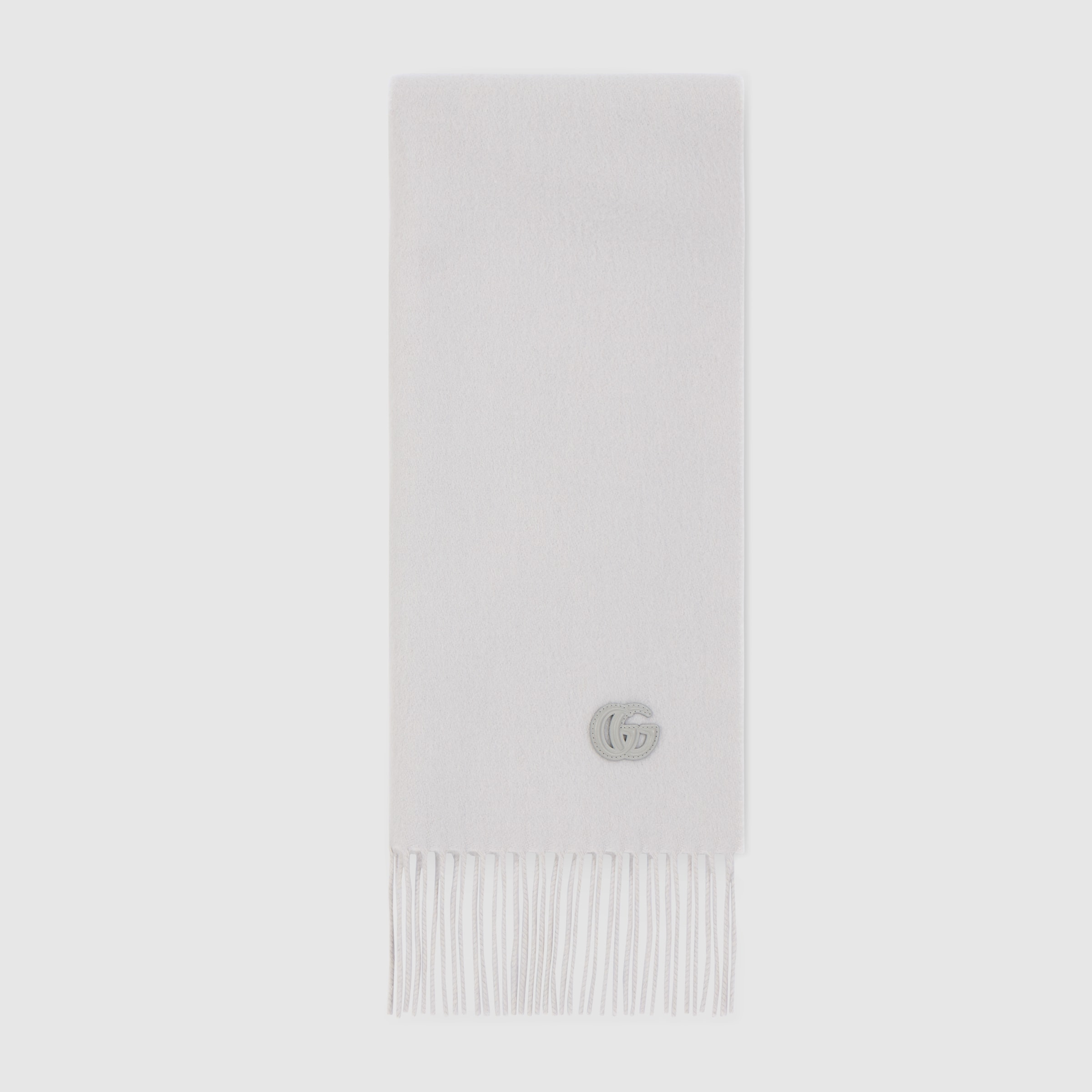 The Pre-Fall 2025 soft and silk accessories' collection animate House codes through sophisticated trimmings, logo patches and subtle embroideries. This cashmere scarf is defined by a Double G leather patch and a tonal fringe trim. - Grey and light grey cashmere - Fringe trim - Double G leather patch - 13.7"W x 74.8"L - Made in Italy