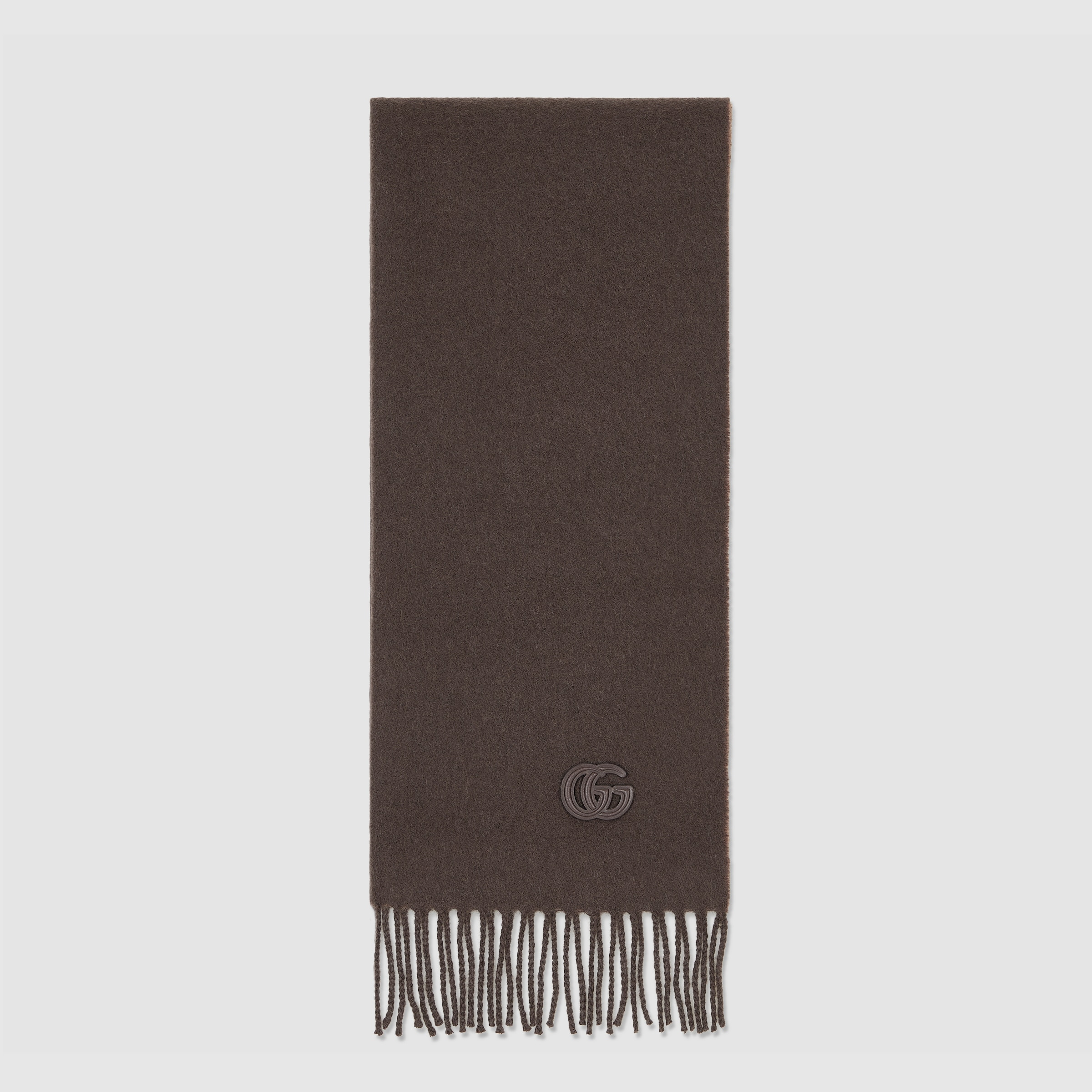 The Pre-Fall 2025 silk accessories collection animates House codes through sophisticated trimmings, logo patches and subtle embroideries. This cashmere scarf is enriched with a Double G leather patch and a fringe trim. - Dark brown and beige cashmere - Fringe trim - Double G leather patch - 13.7"W x 74.8"L - Made in Italy