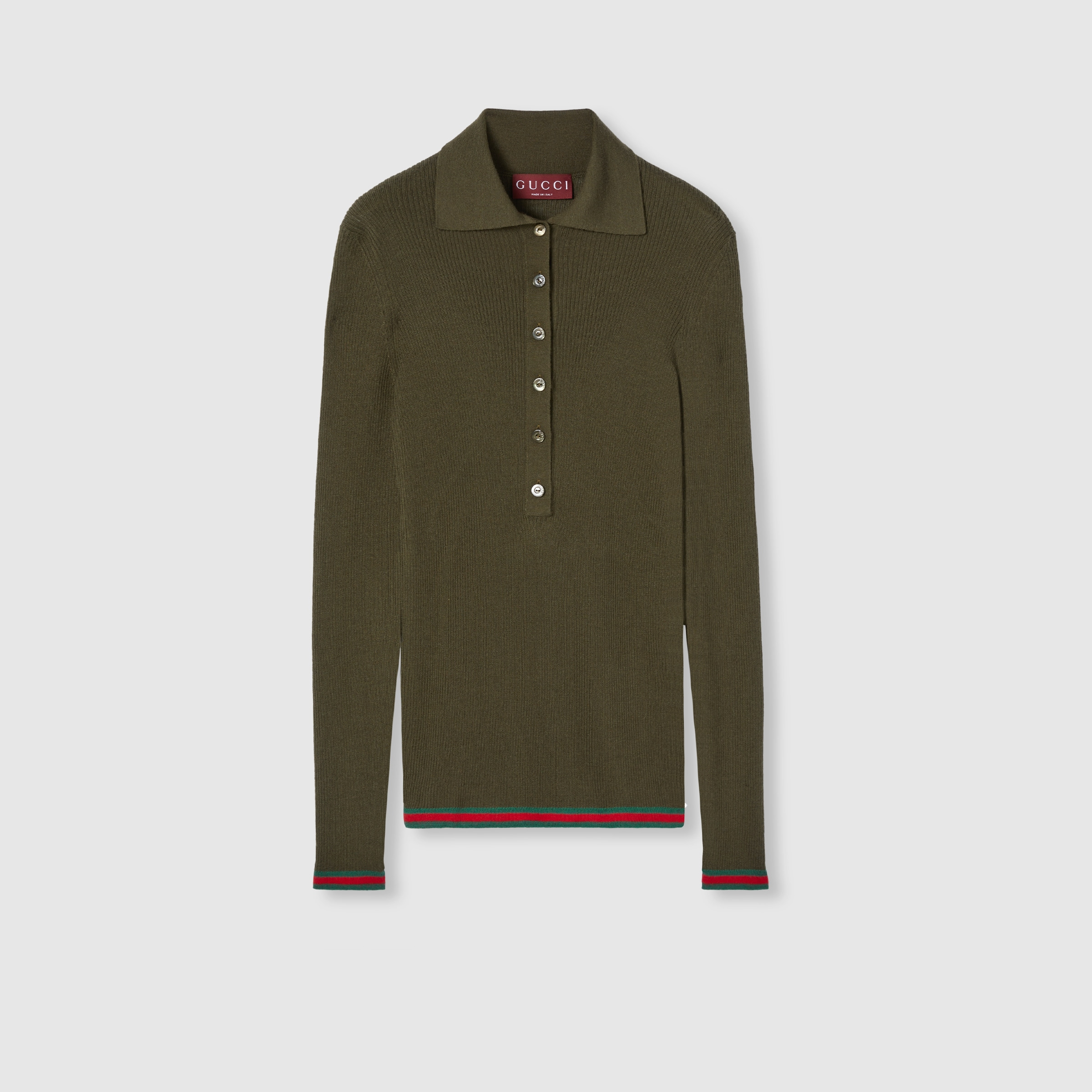 Gucci's House codes continue to evolve for Pre-Fall 2025 across relaxed knitwear pieces. Crafted from an extra fine cashmere and silk rib, this polo top reveals a Gucci embroidered detail on the front and reveals a green and red Web trim across the cuffs and hem. - Forest green extrafine cashmere and silk rib - Gucci embroidered detail on the placket - Polo collar - Long sleeves - Web trim - Button closure - Length: 25.2"; Shoulder: 11"; Half waist/chest: 12.6"; Sleeves length: 25.2" based on a size S - Made in Italy - Fabric: 70% Cashmere, 30% Silk - Details: 54% Cashmere, 26% Silk, 15% Viscose, 3% Polyester, 1% Elastane, 1% Polyamide