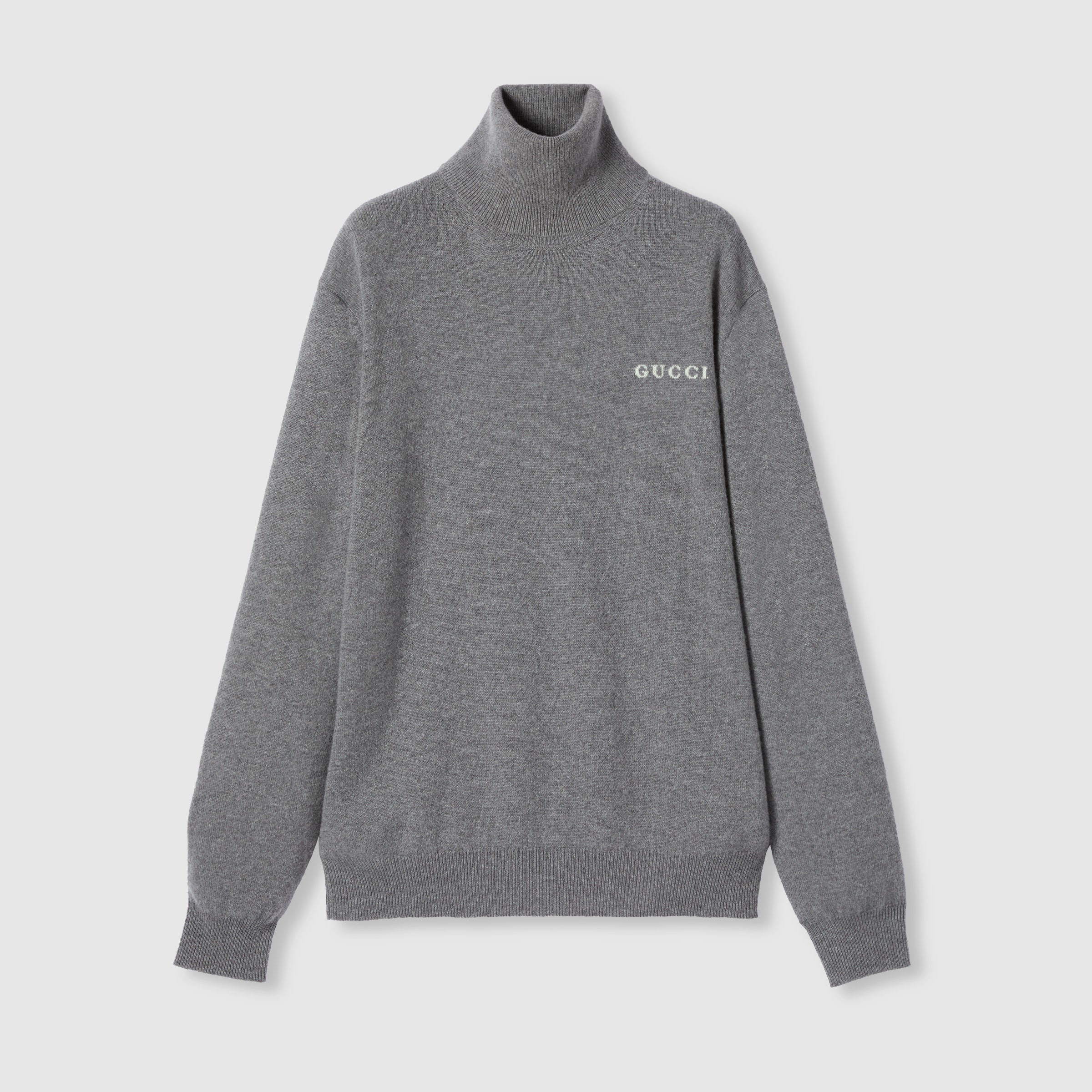 The Pre-fall 2025 collection introduces a new take on warm materials on sophisticated knitwear pieces, in traditional and contemporary silhouettes. This cashmere turtleneck top is defined by a delicate Gucci intarsia. - Grey and white cashmere - Gucci intarsia - Turtleneck - Dropped shoulder - Rib trim - Made in Italy