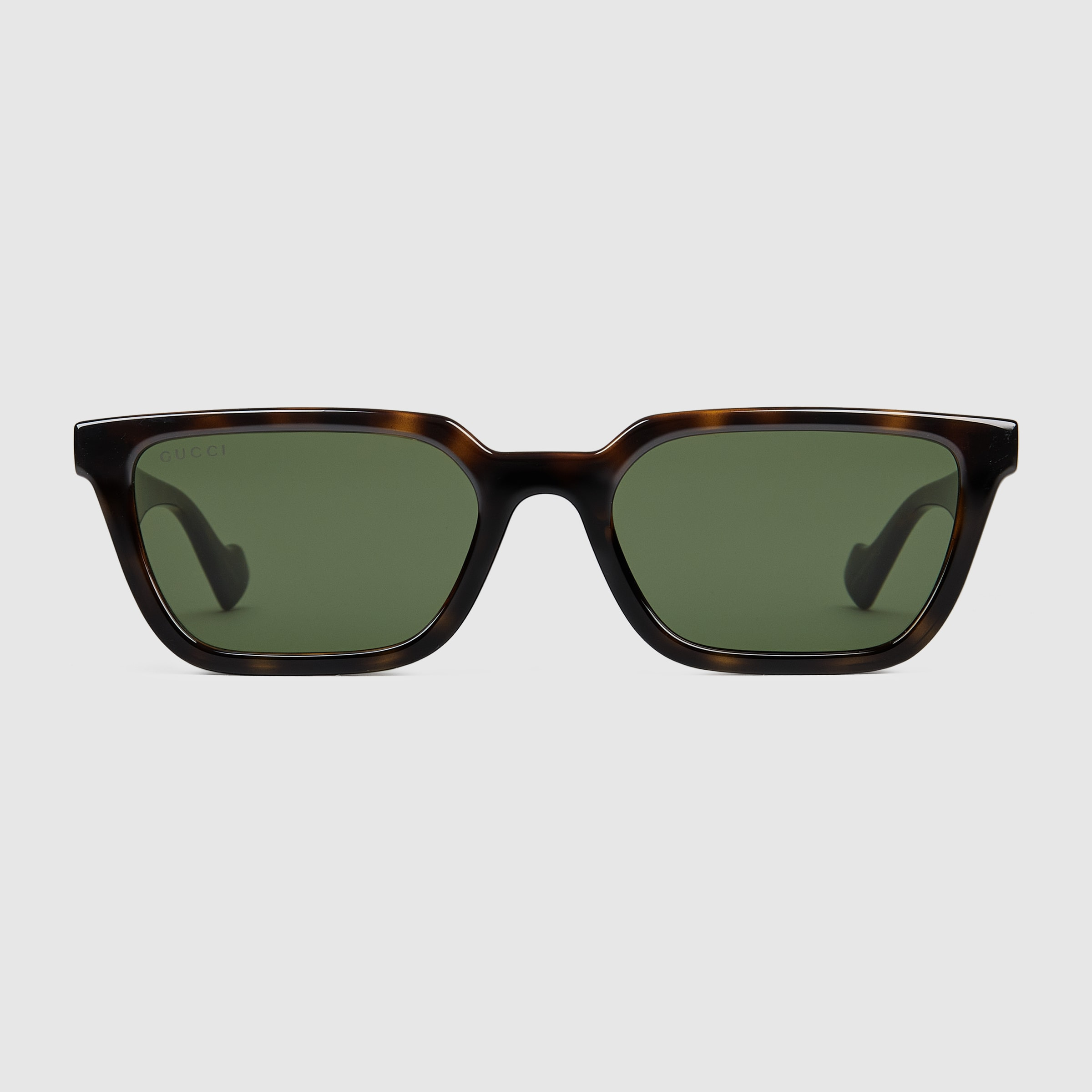 Gucci continues to reimagine everyday accessories in new ways. These cat-eye sunglasses are characterized by a dark brown injected frame and temples are further enhanced by the House's logo script. Solid dark green lenses complete the design. - Shiny dark brown injection frame - Shiny dark brown injection temples with metal gold-toned Gucci engraved detail - Solid dark green lens - 100% UVA/UVB protection - GG1539S - Temple length: 5.7', lens height: 1.4', nose bridge length: .07' - Frame height: 1.6"; Frame width: 5.7" - Made in Italy - The glasses will arrive in a velvet case, available in a range of six jewel-toned colors, and paired with a coordinating satin lining. The case color will be individually selected for each pair of glasses, and comes with a matching satin flannel pouch and ivory microfiber cloth.