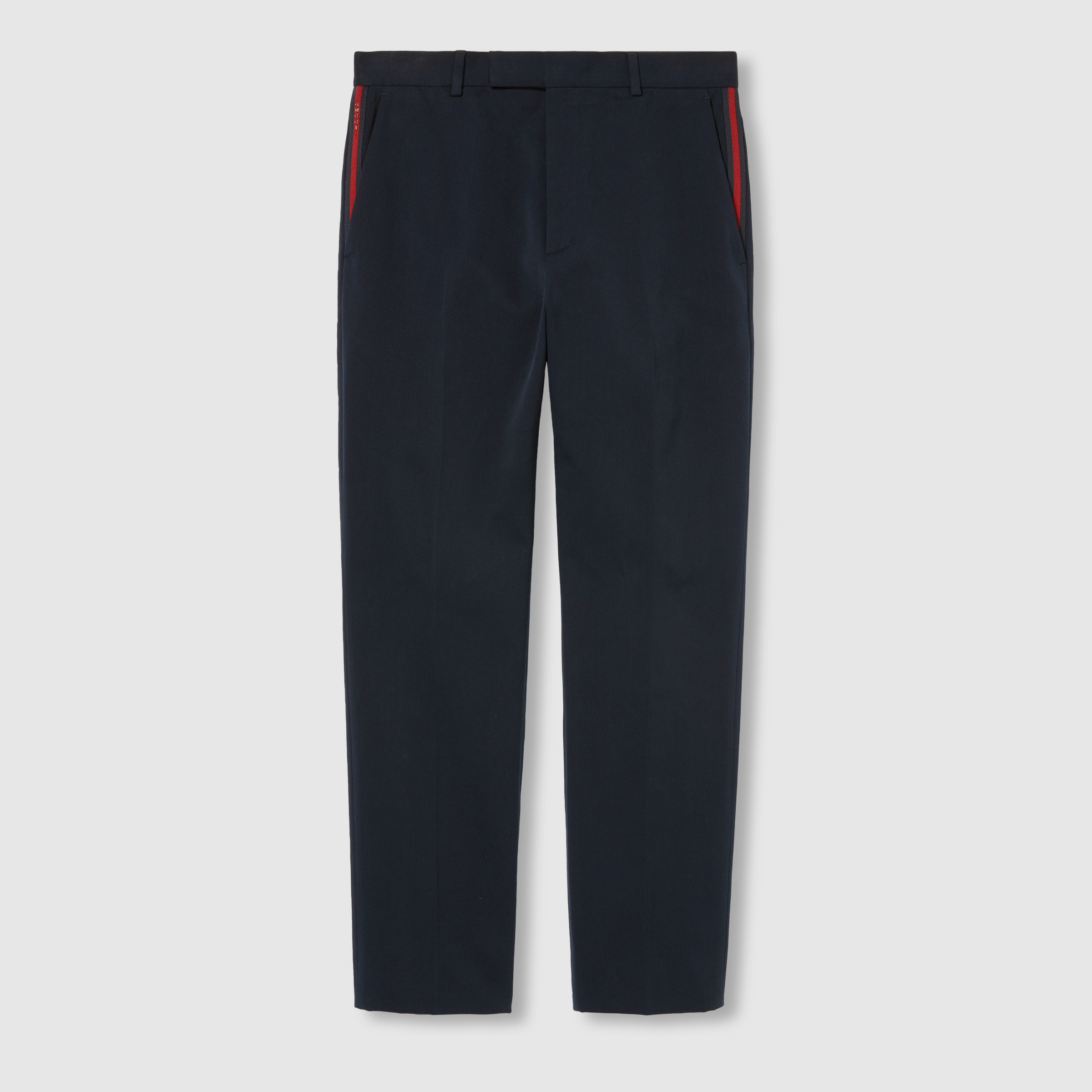 Gucci's House codes continue to evolve for the new season. These regular fit pants are presented in cotton gabardine. The Gucci Web inserts on the side slit pockets adds a twist, for a striking seasonal addition to your wardrobe. - Blue cotton gabardine - Gucci Web inserts - Belt loops - Two side slit pockets - Two back pockets - Hook and zip closure - Cut for a regular fit - Length: 42.5"; Waist: 17.1"; Hips: 21.3"; Hem width: 8.1"; based on a size 48 IT - Made in Italy - The product shown in this image is a size 48 (IT)