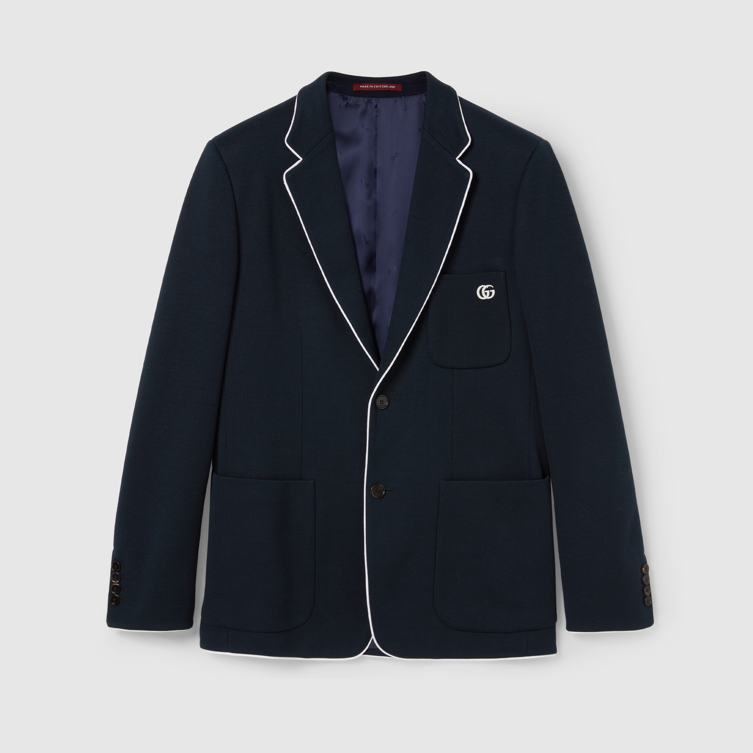 Classics such as elegant shirts and tailored jackets throughout the Cruise 2025 collection stand out with subtle details that elevate everyday looks. This single-breasted jacket is stated in a cotton jersey and features a white piping trim and Double G embroidery. - Dark blue cotton jersey - White piping trim - Horn buttons - Double G embroidery - Lined - Single-breasted - Notch lapel - Chest pocket - Two front pockets - Button closure - Total length: 29.1"; Shoulder: 17.7"; Sleeves length: 35"; based on a size 48 IT - Made in Italy - The product shown in this image is a size 48 (IT)