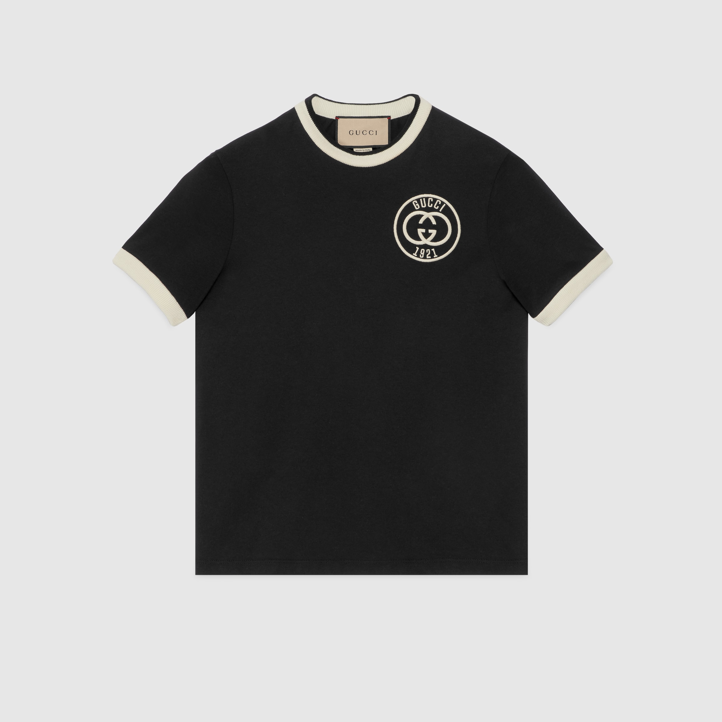 Sporty yet retro, Gucci's interpretation of activewear comes through in its Interlocking G logo in the new collection. The subtle motif, with just a touch of nostalgic inspiration, adorns this cotton jersey T-shirt, channelling a refined aesthetic. - Black cotton jersey - Ivory trim - Interlocking G Gucci 1921 embroidery - Crewneck - Short sleeves - Rib trim - Made in Italy - The model is 5'9" and is wearing size extra small