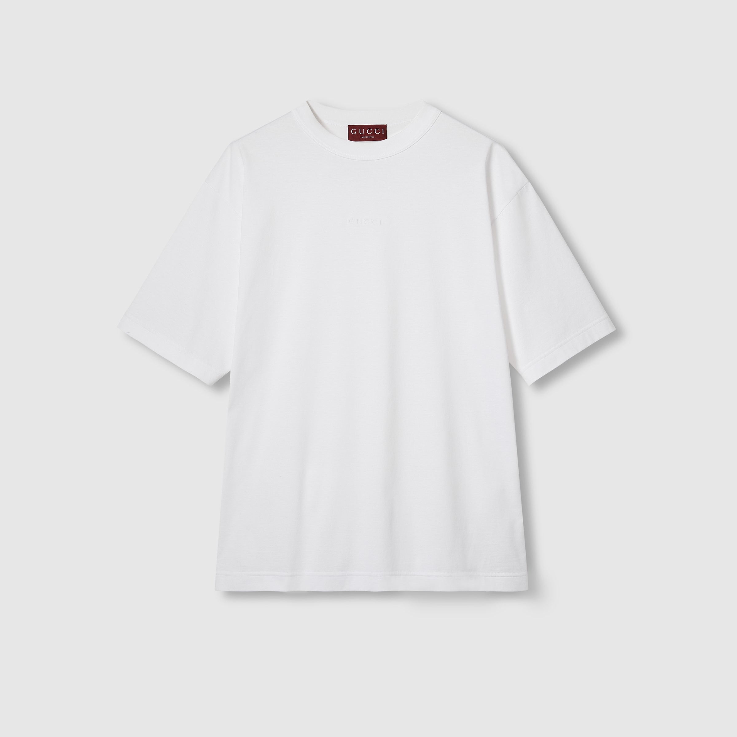 Inspired by the summer spirit and beach clubs on the Italian coast, this item is part of Gucci Lido. This oversized T-shirt is made from a soft lightweight cotton jersey and features a Web loop detail and Gucci embroidery. - White lightweight cotton jersey - Blue and red Web loop detail on the back - Gucci embroidery - Crewneck - Dropped shoulder - Short sleeves - Rib trim - Oversize fit - Made in Italy - The product shown in the image is a size small
