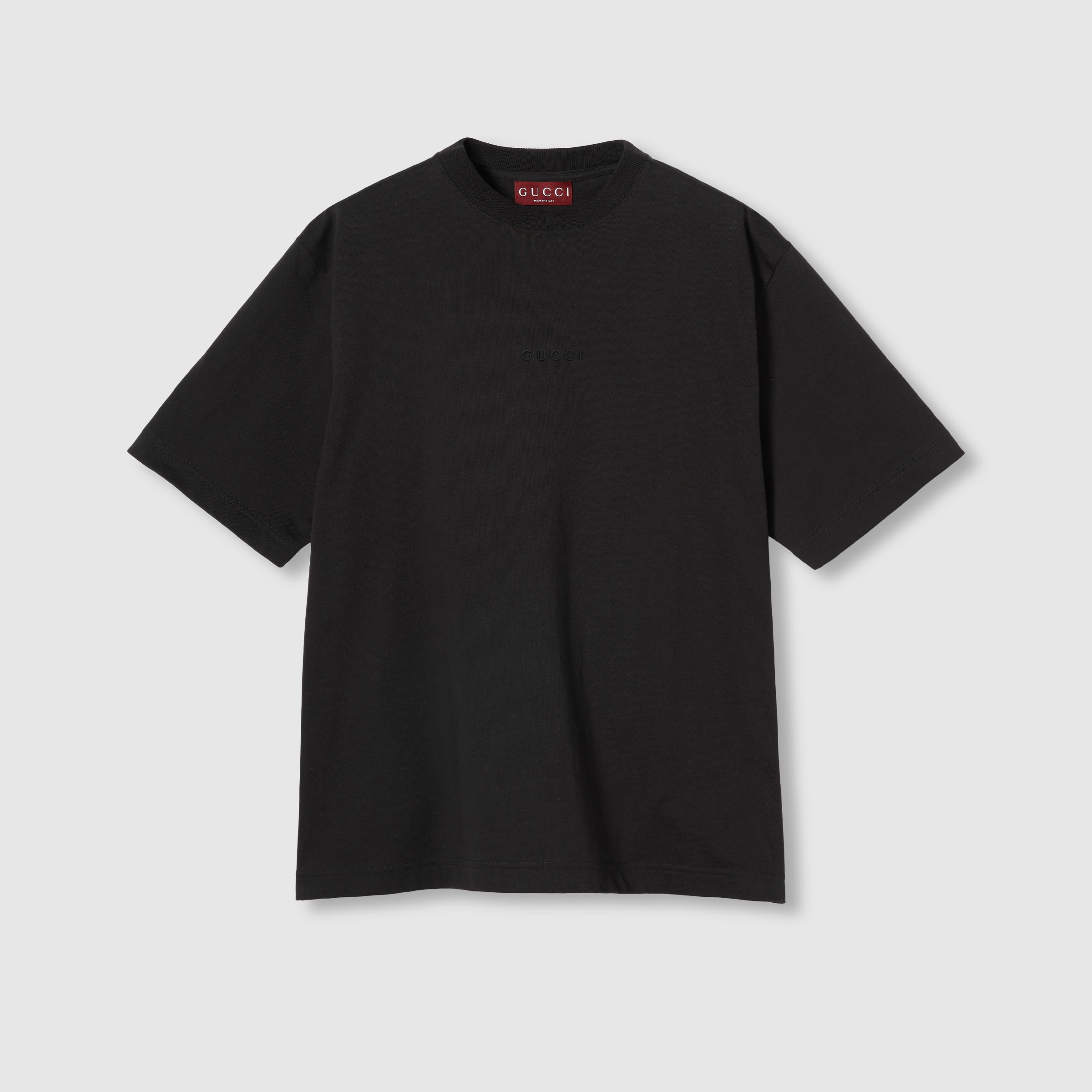 Part of the men's Fall Winter 2024 collection, everyday ready-to-wear pieces are elevated thanks to high quality materials and impeccable craftsmanship. This oversize fit T-shirt appears in a black heavy felted cotton jersey, while a Gucci embroidery enriches the chest. - Black heavy felted cotton jersey - Gucci embroidery - Crewneck - Dropped shoulder - Short sleeves - Rib trim - Regular fit - Length: 28.9"; Shoulder: 19.7"; Chest: 22"; Sleeves length: 8.5"; based on a size M - Made in Italy - The model is 6'1" and is wearing size small