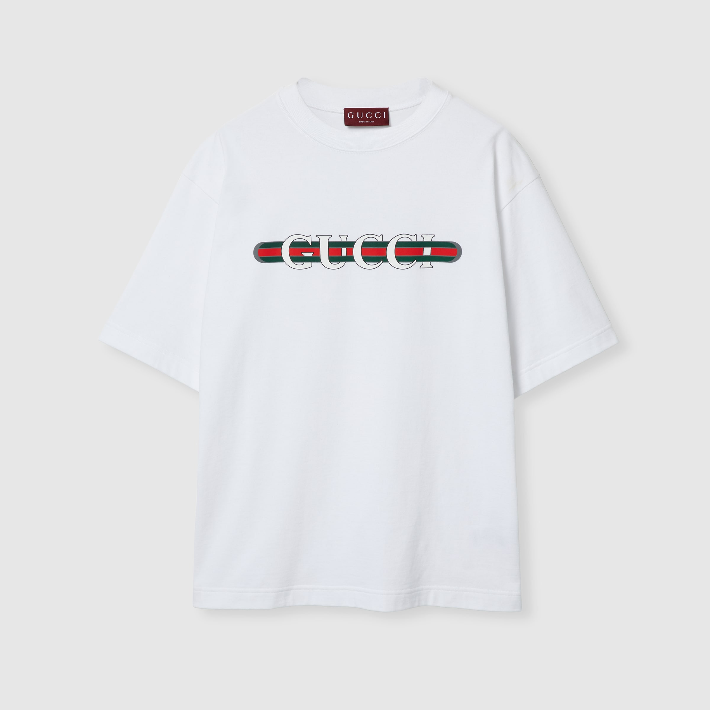 Inspired by the summer spirit and beach clubs on the Italian coast, this item is part of Gucci Lido. Emblematic codes of the House and refined patterns are reinterpreted in contemporary ways for the Pre-Fall collection. Presented in white cotton jersey, this T-shirt is defined by a Gucci Web print. - White heavy cotton jersey - Gucci Web print - Crewneck - Dropped shoulder - Short sleeves - Oversize fit - Made in Italy - The product shown in the image is a size small