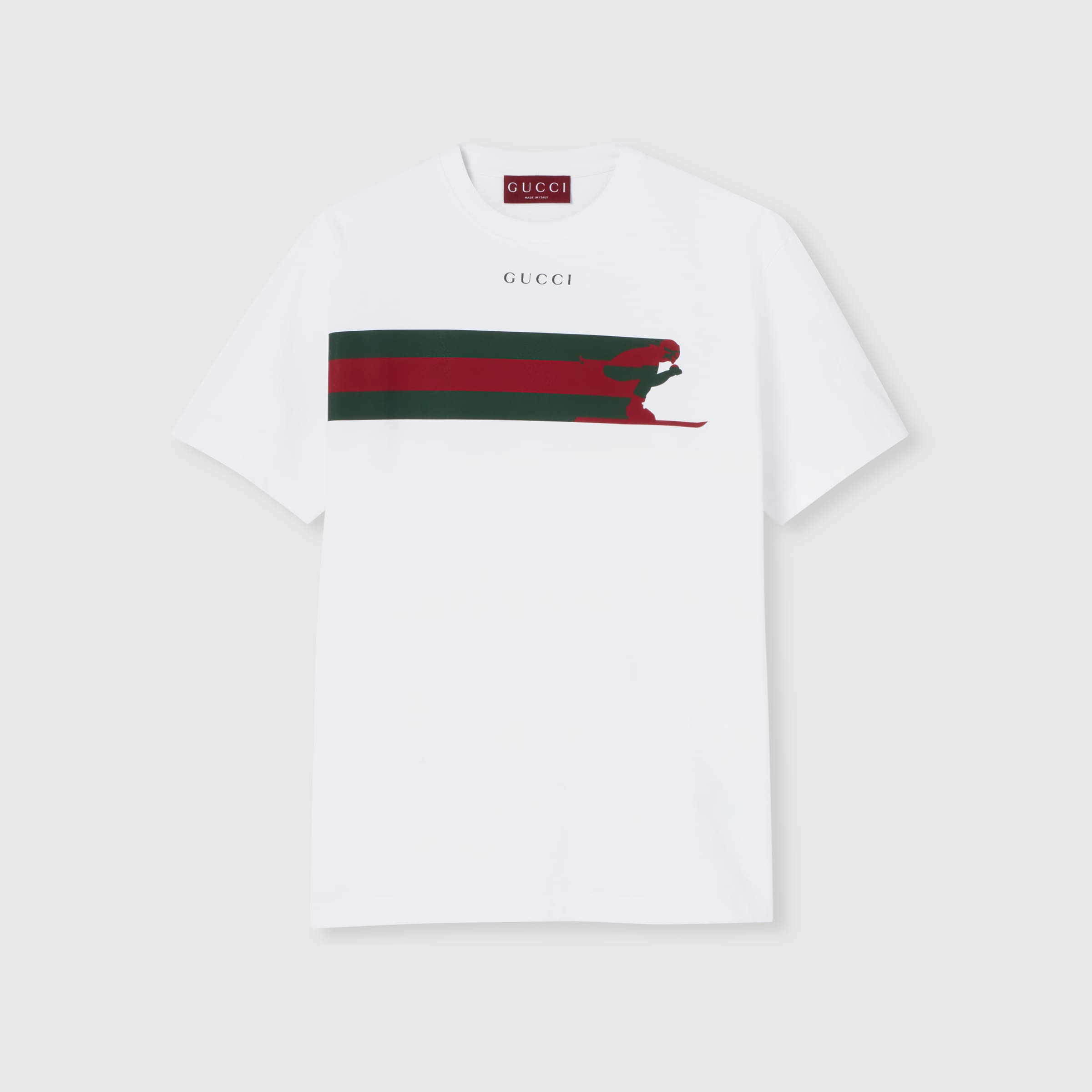 Gucci's House codes continue to evolve for the new season across jersey pieces. This T-shirt is presented in a white cotton jersey and is defined by a Gucci skier Web print. - White cotton jersey - Gucci skier Web print - Crewneck - Dropped shoulder - Short sleeves - Rib trim - Regular fit - Total length: 28.9"; Shoulder: 19.7"; Chest: 22"; Sleeves length: 8.5"; (size M) - Made in Italy