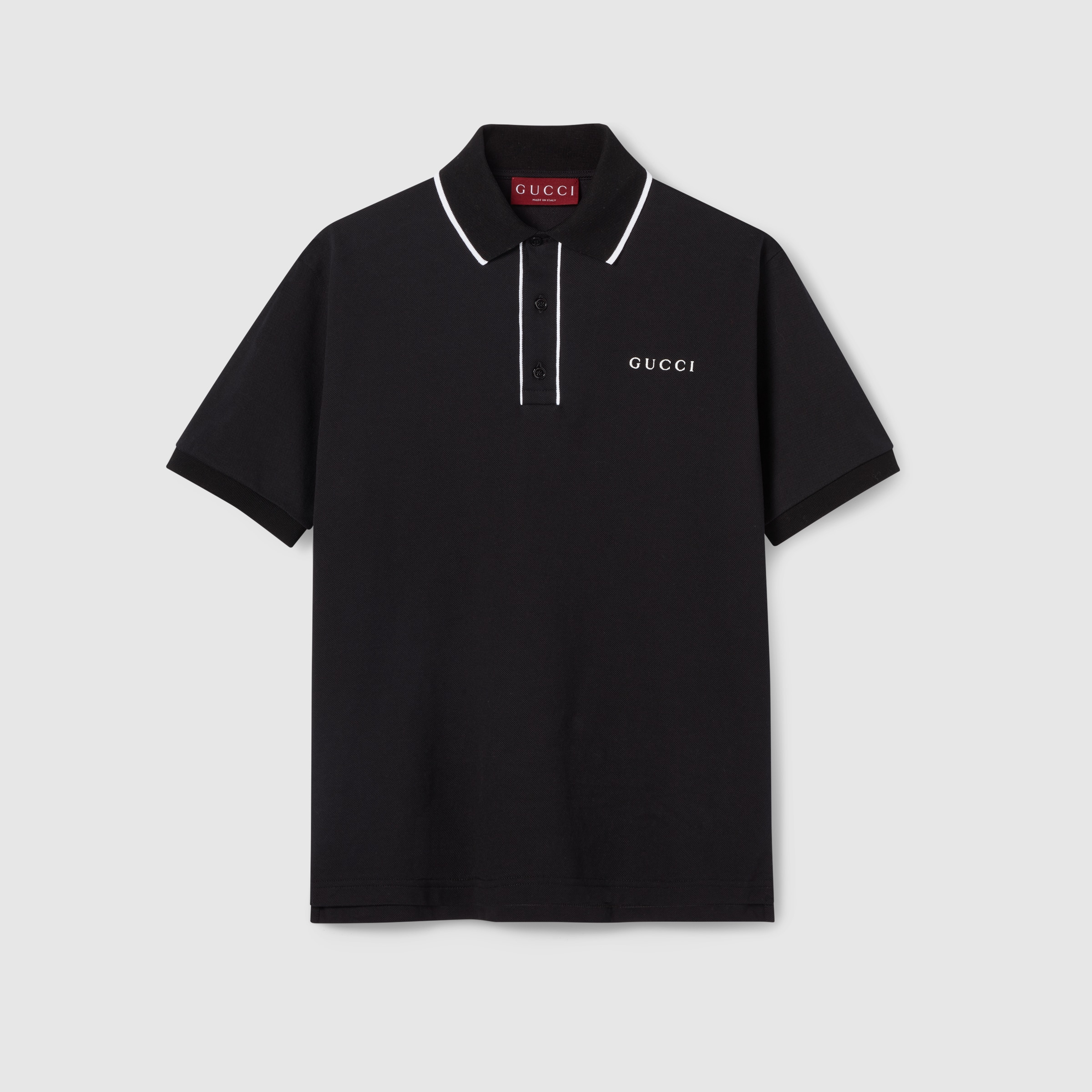 Pre-Fall 2025 pieces in muted black, grey and green tones spotlight delicate floral embroideries, embossed logos, and more craftsmanship details. Crafted from black cotton piquet, this polo shirt is defined by a Gucci embroidery. - Black cotton piquet - White piping trim - Gucci embroidery - Polo collar - Dropped shoulder - Short sleeves - Rib trim - Button closure - Regular fit - Length: 28.7"; Shoulder: 18.7"; Chest: 22.4"; Sleeves length: 9.4"; based on a size M - Made in Italy