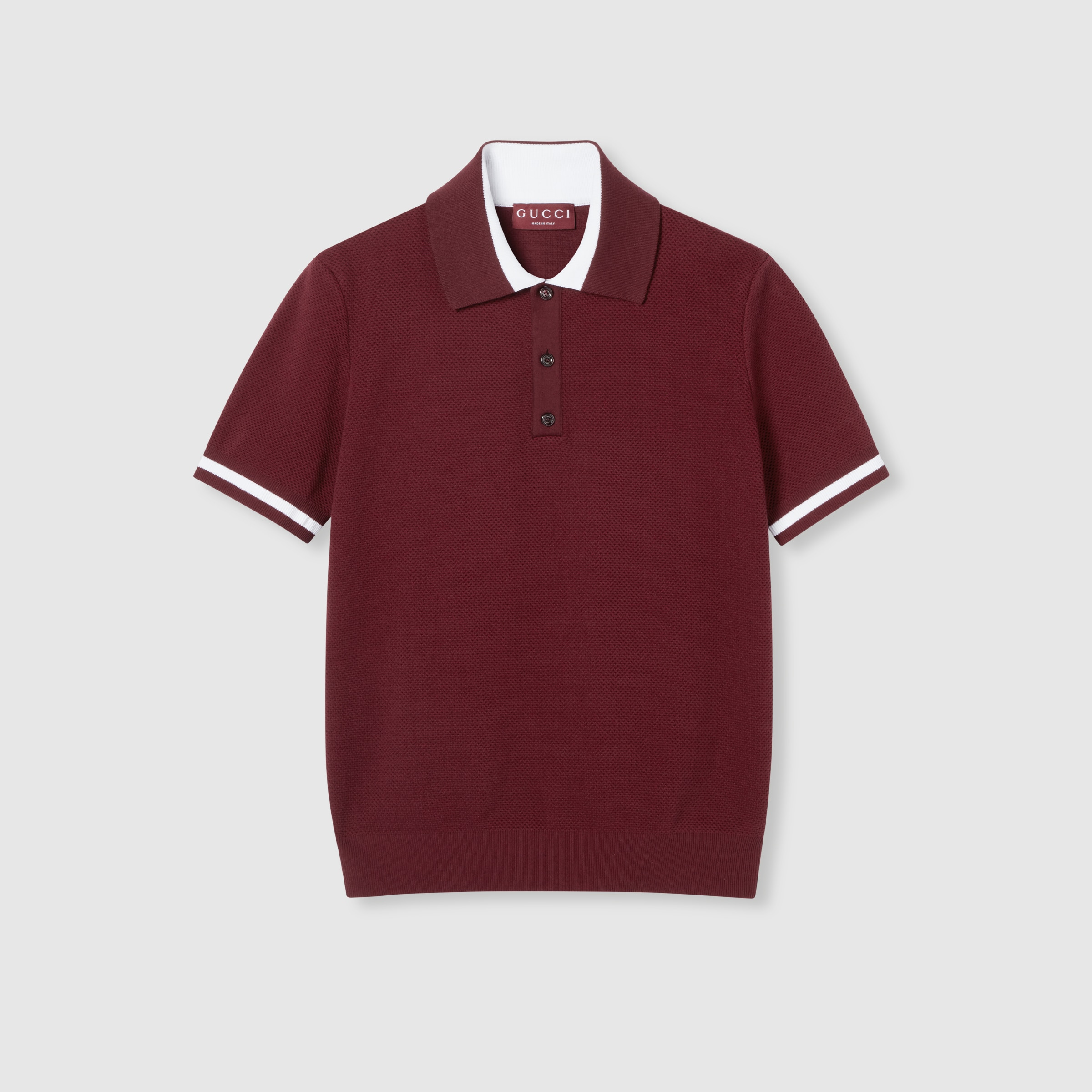 The Pre-Fall 2025 collection spotlights essential silhouettes with emblematic details from daywear to eveningwear. This polo T-shirt is made from cotton piquet knit and reveals a contrasting Gucci intarsia along the button line. - Gucci Rosso Ancora red cotton piquet knit - Gucci intarsia - Polo collar - Short sleeves - Rib trim - Shoulder drop: 16.9"; based on a size S - Chest: 19.8"; based on a size S - Sleeves length: 9.4"; based on a size S - Button closure - Length: 25.5"; based on a size S - Made in Italy