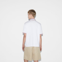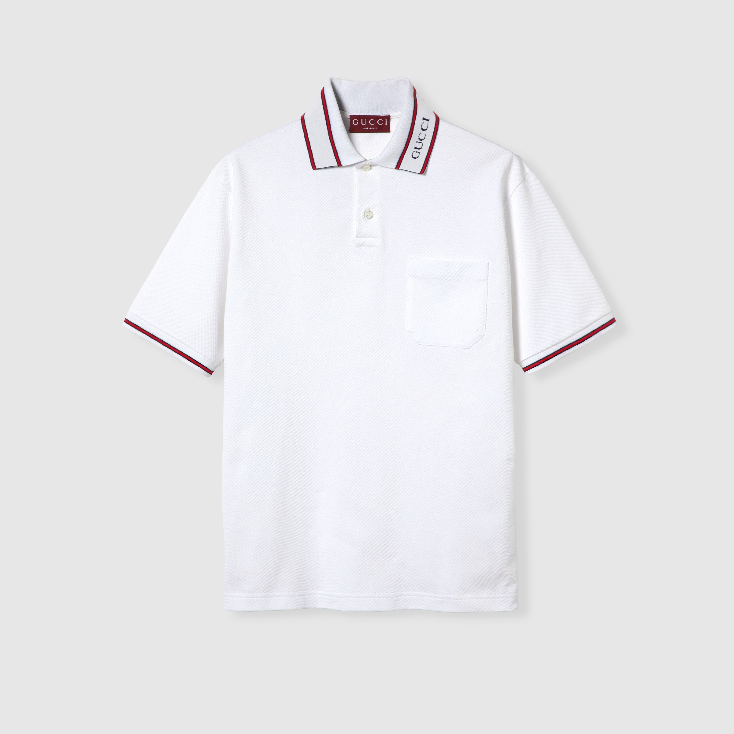 Inspired by the summer spirit and beach clubs on the Italian coast, this item is part of Gucci Lido. With white as a fresh canvas, the Web is being re-envisioned as unique details through special constructions and stitching techniques that elevate this stretch cotton piquet polo shirt to an essential piece in the Pre-Fall wardrobe. - White stretch cotton piquet - Gucci jacquard detail - Blue and red Web stripe detail - Point collar - Short sleeves - Chest pocket - Button closure - Regular fit - Made in Italy - The product shown in this image is a size small