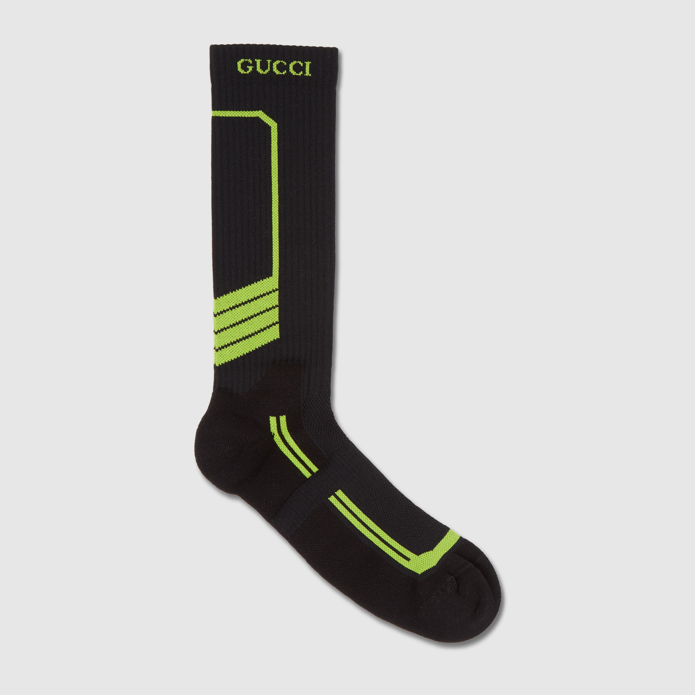 Gucci Altitude, the House's first winter sportswear collection, combines advanced performance and signature codes. Crafted from black and green cotton, these socks reveal an embroidered Gucci logo. - Black and green cotton - Embroidered Gucci logo - Made in Italy - Please note that intimates, including swimwear, tights, socks and lingerie can only be returned in new condition. Items should be unworn, in their original packaging and with all labels attached