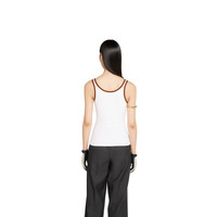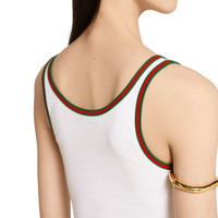 In the Spring Summer 2025 collection, the theme of casual grandeur pairs basic pieces such as the tank top and denim pant with long coats. This tank top has been crafted from a cotton rib and completed with a Gucci embroidery and green and red Web trim. - White cotton rib - Green and red Web trim - Gucci embroidery - Length: 23.6"; Shoulder: 9.9"; Chest: 12" based on a size extra small - Made in Italy - The model is 5'8" and is wearing size extra small