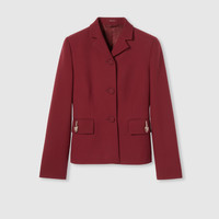 The Pre-fall 2025 collection introduces a new take on warm materials on sophisticated outerwear pieces, in traditional and contemporary silhouettes. This single-breasted jacket in cady crepe wool silk features the historic tiger head atop the two front pockets. - Gucci Rosso Ancora red cady crepe wool silk - Tiger head detail - Lined - Notch lapel - Single-breasted - Two flap pockets - Fitted waist - Button closure - Made in Italy