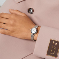 The Diamantissima watch features the signature Diamante pattern etched into the case. The tonal motif lends a delicate finish to the case. - Steel case with white mother of pearl dial, steel mesh bracelet - The warranty certificates for Gucci watches purchased after March 1st 2022 are exclusively available online. - Download your certificate at - by using the serial number engraved on the back of your watch. - Quartz movement - Water resistance: 5 ATM (160 feet/50 meters) - Wrist size adjustable from 162mm to 196mm - YA141504 - Swiss Made