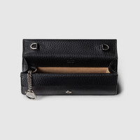 A structured leather chain super mini bag with a key ring that can be used to attach this bag to a separate larger bag. The closure has the textured tiger head spur closure-a unique detail referencing the Greek god Dionysus, who in myth is said to have crossed the river Tigris on a tiger sent to him by Zeus. The tiger head closure is enriched with Swarovski crystal stones. Made in resistant textured leather. - Black metal-free tanned leather - Palladium-toned hardware - Attached key ring that can attach to a separate bag - Tiger head motif with enamel and crystals - Chain shoulder strap with 23.6" drop - Pin closure with side release - Mini size: 6.5" Wx 3.9" H x 1.6" D - Weight: 10.5 oz approximately - Made in Italy - Fits up to iPhone Pro, card case, and lipstick