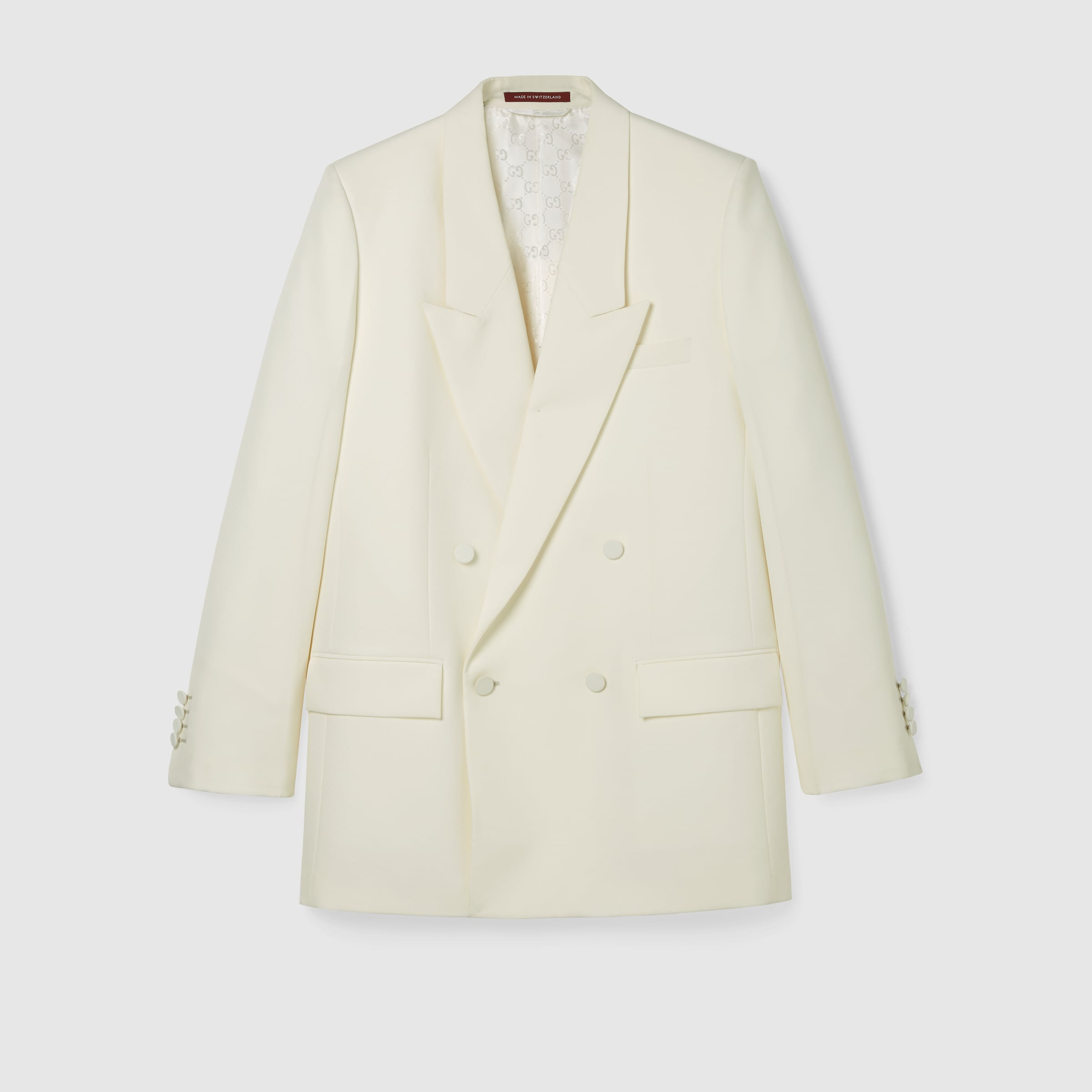 In the Fall Winter 2025 collection, an elegant contrast of black and white defines the evening selection. Monochrome looks are built around double-breasted jackets and wide-leg pants, offering silhouettes that are both essential and deeply refined. - Ivory technical panama - Fully lined with tonal GG - Double-breasted - Peak lapel - Covered buttons - Chest welt pocket - Two front flap pockets - Oversize fit - Length: 31.9"; (size 48 IT) - Made in Italy