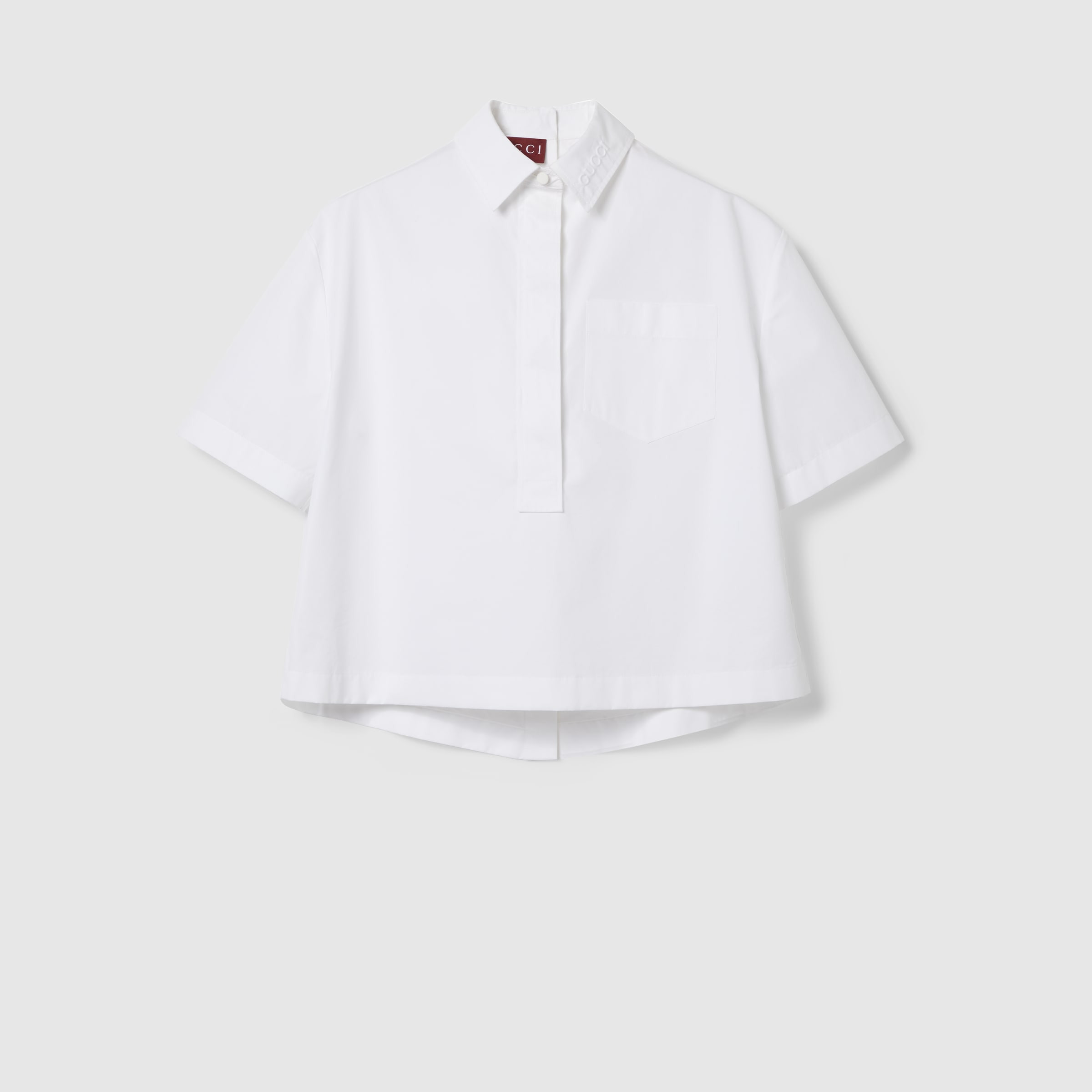 The Gucci Cruise 2025 collection features minimalist garments in either total white or total black, introducing finely constructed pieces in an essential palette. This minimal shirt is presented in a heavy cotton poplin and enriched with self-covered buttons. - White heavy cotton poplin - Self-covered buttons - Unlined - Point collar with embossed Gucci logo - Short sleeves - Breast pocket - Button closure - Length: 23.2"; based on a size 40 (IT) - Made in Italy - The model is 5'8" and is wearing size 40 (IT)