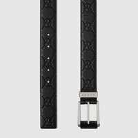 The signature combination of sophisticated leather in neutral shades and a rectangular buckle effortlessly completes business and formal looks. This wide belt is stated in a GG grainy leather and features a squared buckle with Gucci engraving on a metal loop. - Black embossed GG grainy leather - Palladium-toned hardware - Squared buckle with Gucci engraving on metal loop - 1.3" width - Made in Italy - Can be worn as a hip or waist belt. Sizing will differ based on where the belt is worn, please refer to the size guide to find your size.